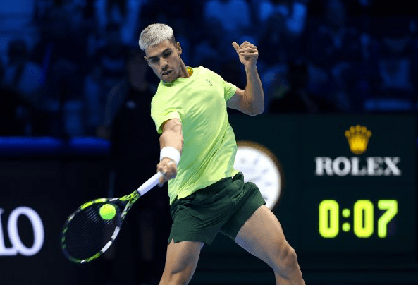 虎扑11月09日讯ATP年终总决赛小组赛首轮,世界第二阿尔卡拉斯7-6(5)、6-2战胜世界排名第7的德米纳尔,职业生涯首次在总决赛取得小组赛开门红。