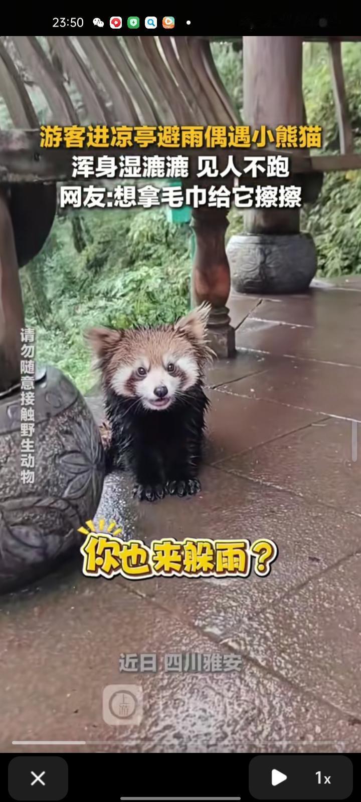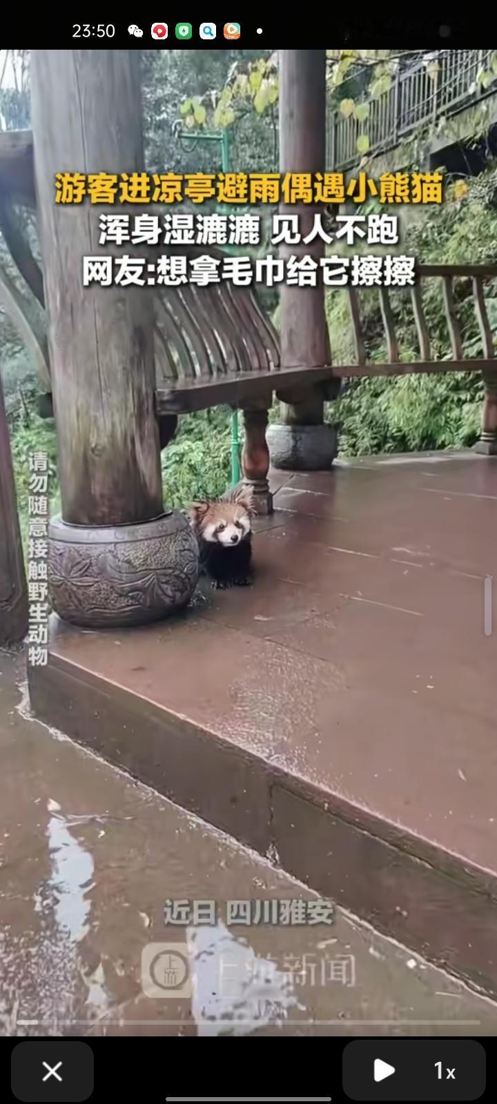 11月4日,四川雅安。网友发视频称,自己在瓦屋山上偶遇小熊猫,浑身湿漉漉的,见人不跑。当事人表示,上山的时候没遇到,下山的时候刚好遇到它在亭子里躲雨
