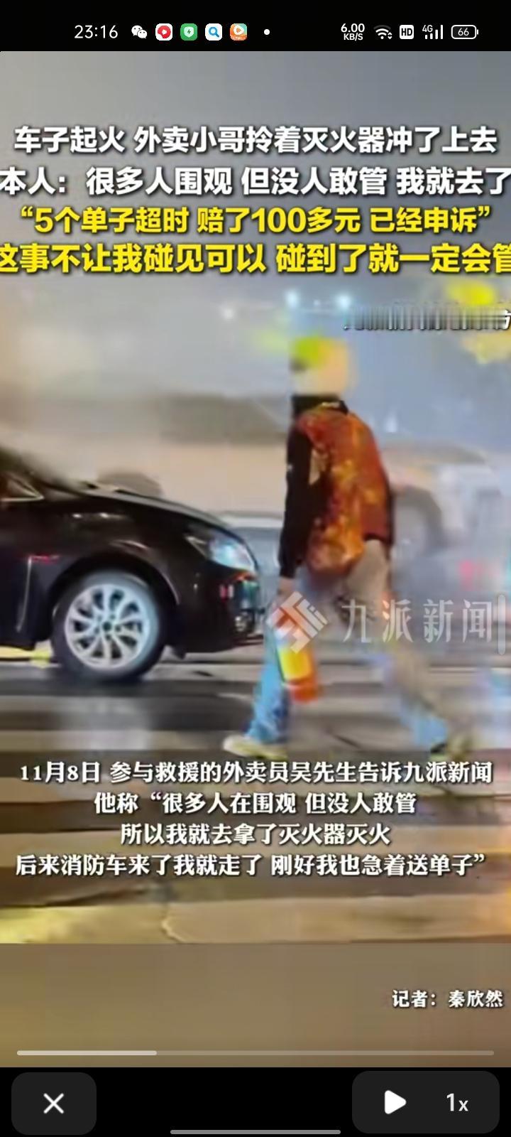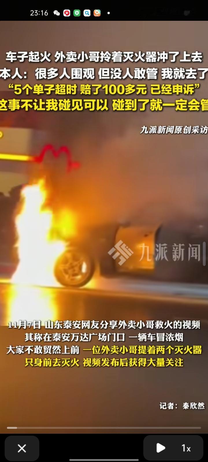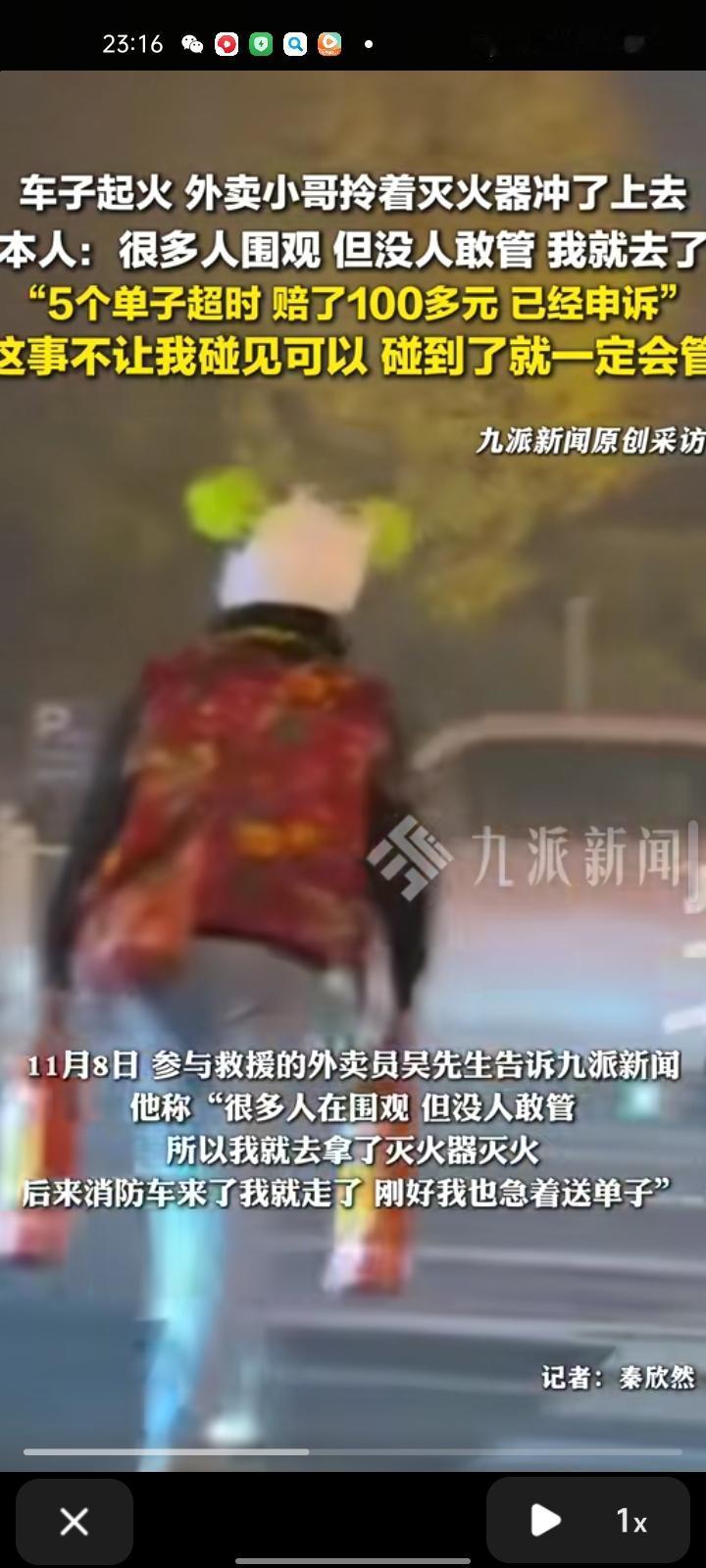 11月7日,山东泰安。万达广场附近有一辆私家车冒着浓烟,大家不敢贸然向前。这时,一位外卖小哥提着两个灭火器只身前去灭火,视频发布后引发大量网友关注。 参与救援的吴先生称,很多人在围观,但没人敢管,所以就拿了灭火器灭火,后来消防车来了我就走了,刚好我也急着送单子。由于帮忙灭火耽误时间,吴先生有五个单子超时,赔了100多元,但他没后悔,“这种事不让我碰见可以,让我碰见一定会管”。 事后,他还接到警务室通知,要求赔偿救火时使用的灭火器,后续经调查核实该灭火器为过期失效器材,警务室确认无需赔偿并致歉。吴先生说,因救火而送超时单子的顾客都表示理解,他已向平台提出申诉,十多分钟就处理完成了。 见义勇为是中华民族的传统美德,也是构建和谐社会的重要支撑。但现实中,“英雄流血又流泪”的担忧,曾让不少人在危险面前犹豫退缩。 在这个需要温暖与担当的时代,我们既需要更多像吴先生这样的平凡英雄,也需要社会各界共同为善意 “保驾护航”。希望平台能尽快取消对吴先生的罚款,并完善相关保障机制,让每一份挺身而出的勇气都得到尊重,每一次善意的付出都不被辜负。唯有如此,才能让见义勇为的精神蔚然成风,让社会充满更多敢于 “出手” 的温暖力量。