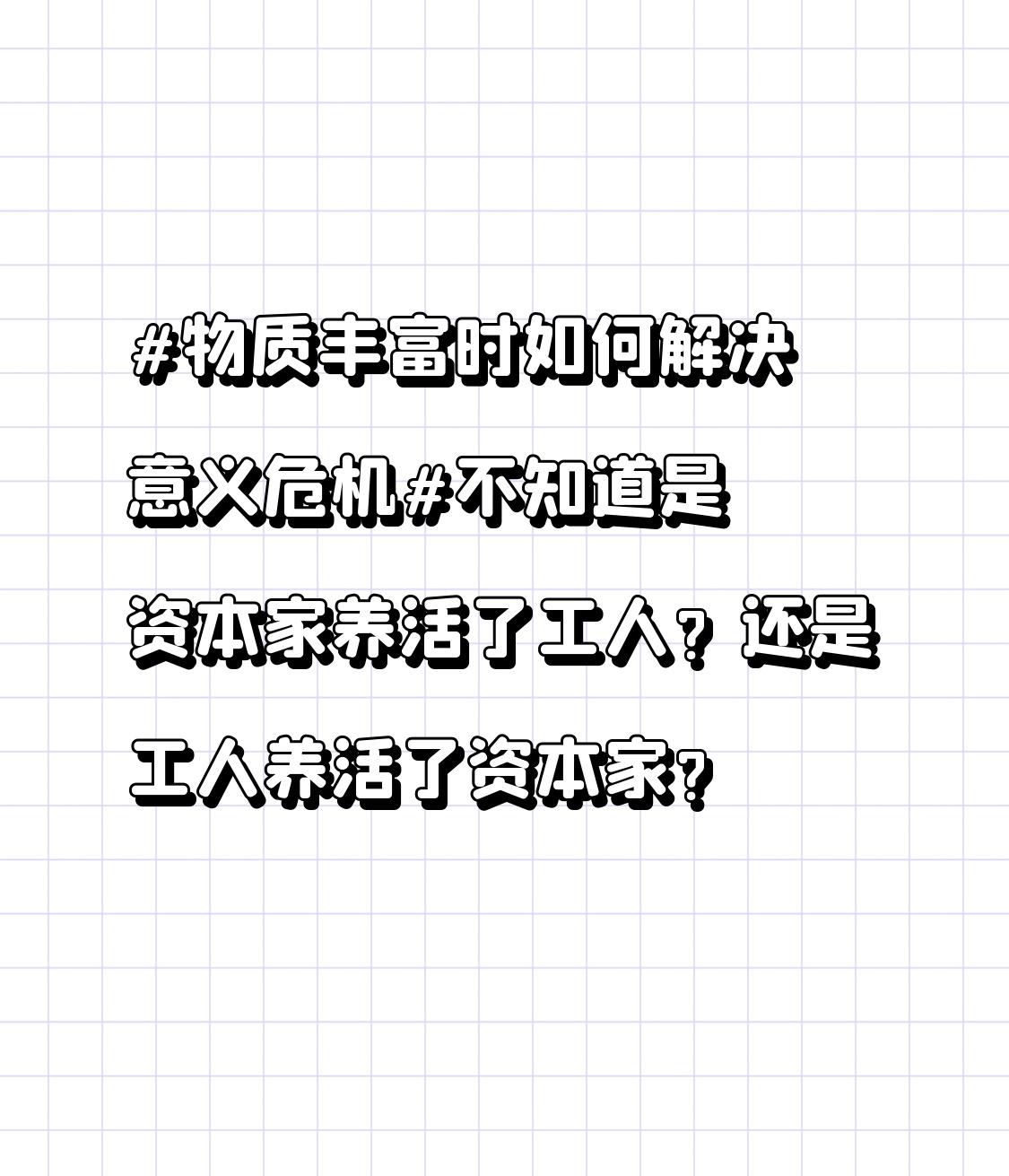 物质丰富时探讨意义危机,这“资本家与工人谁养活谁”的问题就很值得琢磨。有人觉得是工人养活资本家,没工人劳动,哪来产品和财富,资本家还剥削工人。可也有人说,资本家开工厂提供岗位,让工人有工资能生活,企业亏本时资本家承担的风险更大。 按剩余价值理论,工人养活资本家,资本家靠剥削剩余价值获利。但现实是,失业时工人比资本家先饿死,好像是资本家养活了工人。不过这是建立在不公平起点上的。资本家完成原始积累后,应带动共同富裕,而不是继续不公平交易。这两者相互依存,纠结谁养活谁意义不大,关键是追求公平合理的关系。