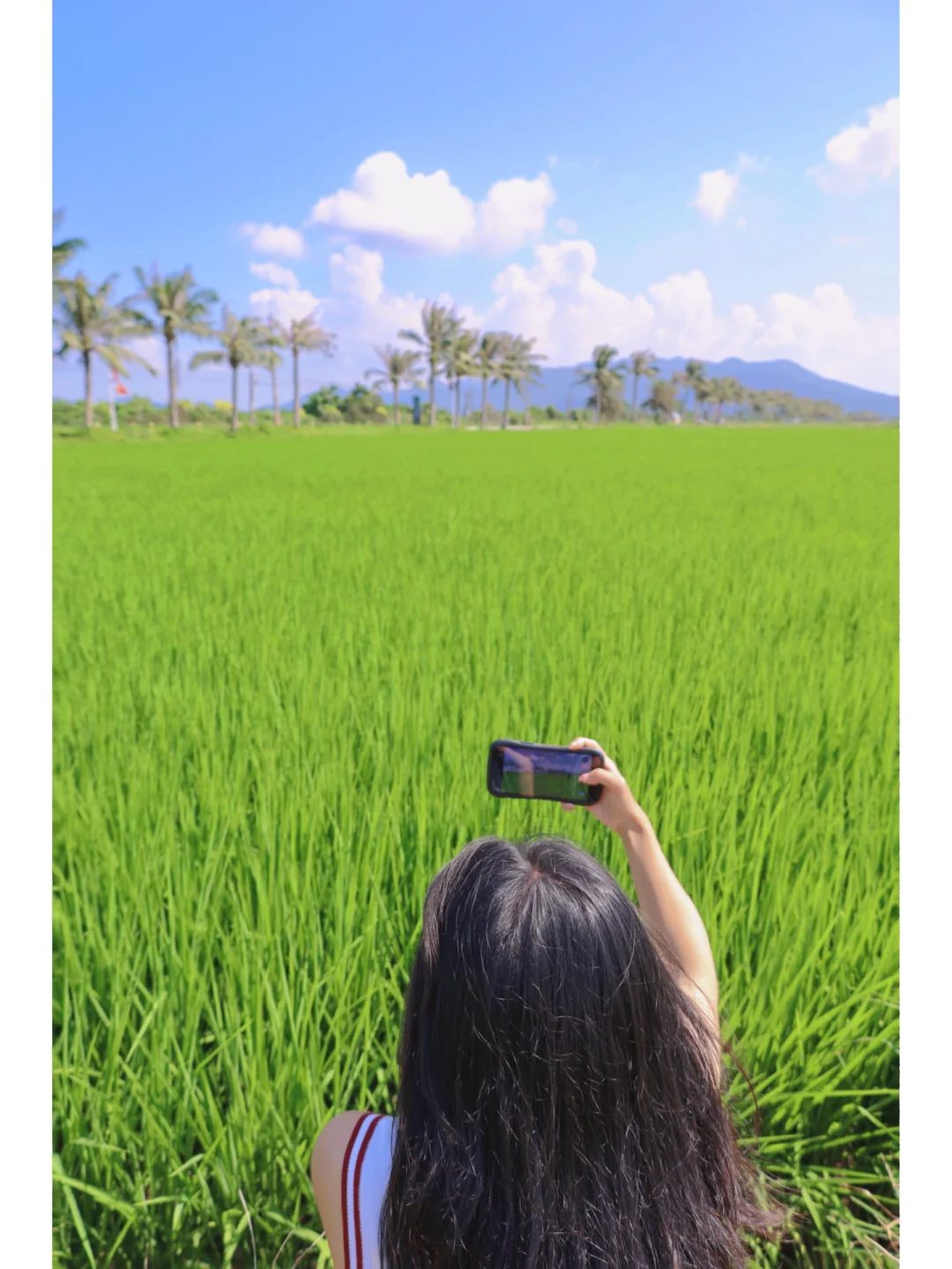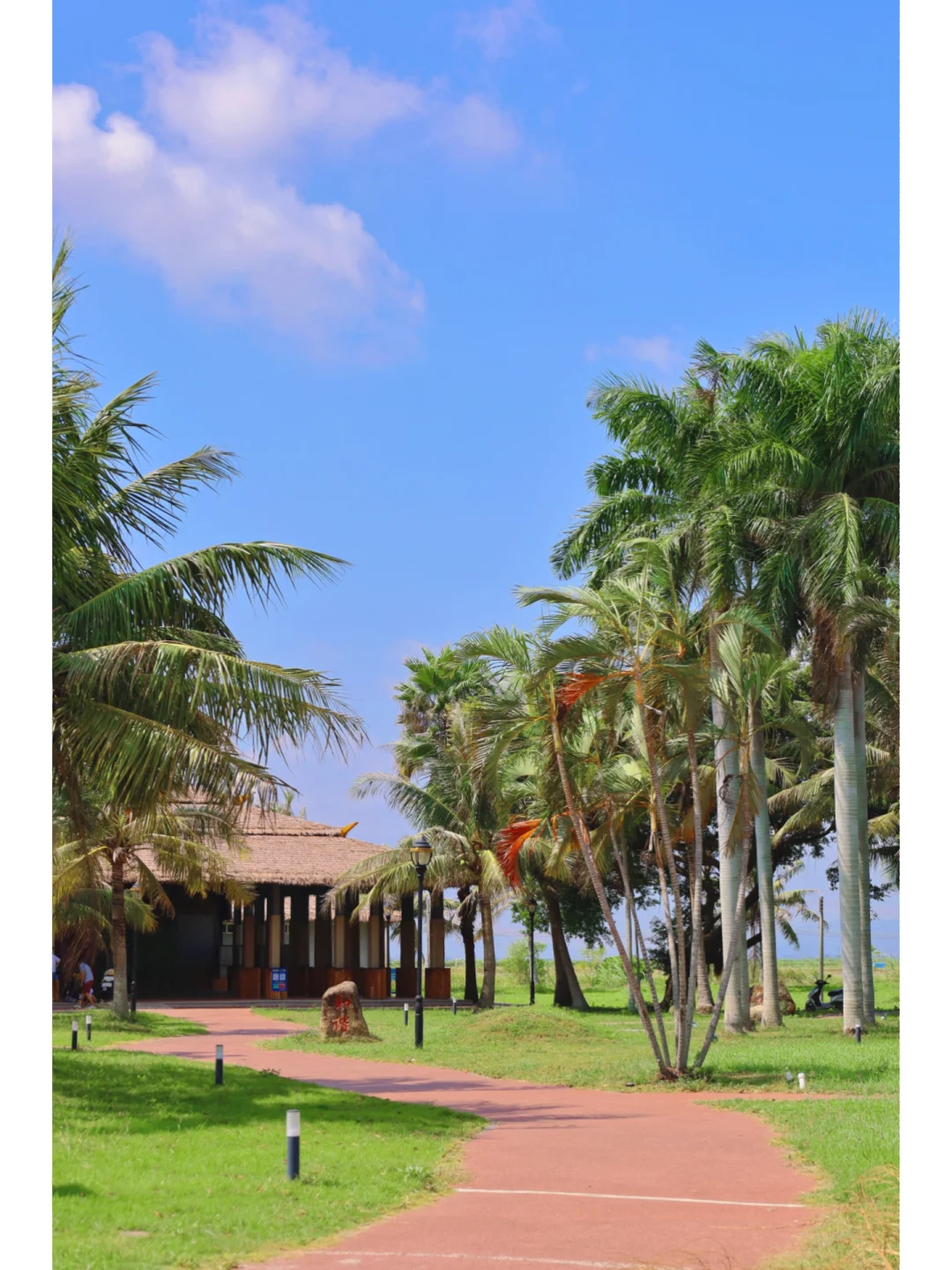 一进海宴华侨农场门口,整条路的两边种满椰树和一大片斑斓田,满眼放去就是很度假风,一阵风吹在田野的斑斓叶,有种风吹麦浪的感觉