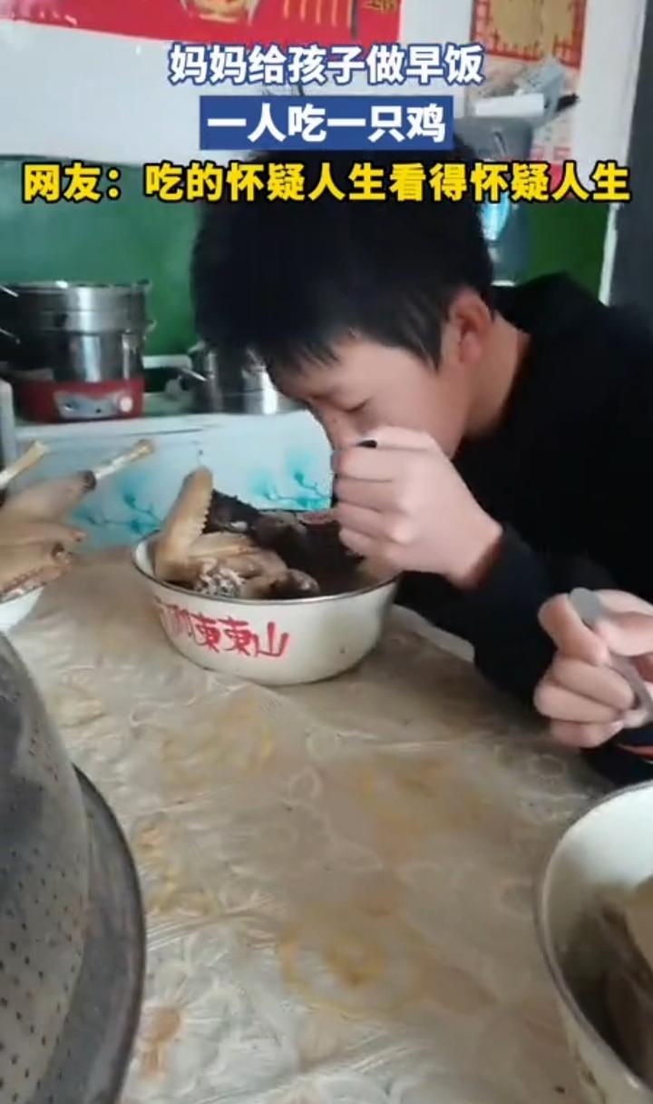 简单粗暴,江西一位妈妈为孩子做早餐,说一定要让孩子吃的有营养,尤其是早餐必须丰盛,孩子的妈妈厨艺欠佳,可她发誓一定要让孩子吃的有营养。 于是单刀匹马去菜市场选购了三只小笨鸡,也许是三只草鸡无论什么品种就是三只鸡,不是广西的那四只,于是早上她起的非常早,把鸡洗洗放入锅内加水盐姜就开火炖,大约一个小时后孩子起床问妈妈,今天吃什么,妈妈说今天吃点不一样的,就一样不过保证你们能吃饱,孩子听的云里雾里。 以前吃早饭都是油条豆浆包子牛奶煎饼花卷稀饭石头什么的种类比较丰富,可这次如此单一孩子们那疑惑的眼神立刻明白这顿早餐不简单,果不其然一会妈妈给每人端上了一盆鸡汤,孩子们非常高兴一人可以吃一个鸡腿了,可大早上的就吃鸡不知道让别人知道,会不会笑话他们是肉食动物。 先不管那么多了,一会喝鸡汤吃点热花卷也是美妙的,让味蕾和美食的交织,定是那食色性也的最佳写照,三份鸡汤上菜完毕后,妈妈和一个儿子大快朵颐的海炫,小儿子却迟迟不肯动口,或许他在想大清早的就吃的这么油腻,妈妈今天是不是有什么问题,试问谁家会早上一人怼一只鸡,如果是我就炖红烧肉,不配米饭干怼,比的就是腻歪。