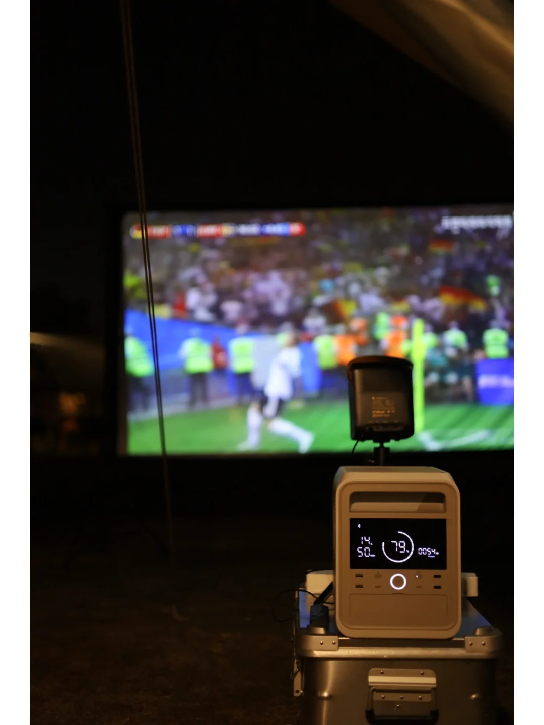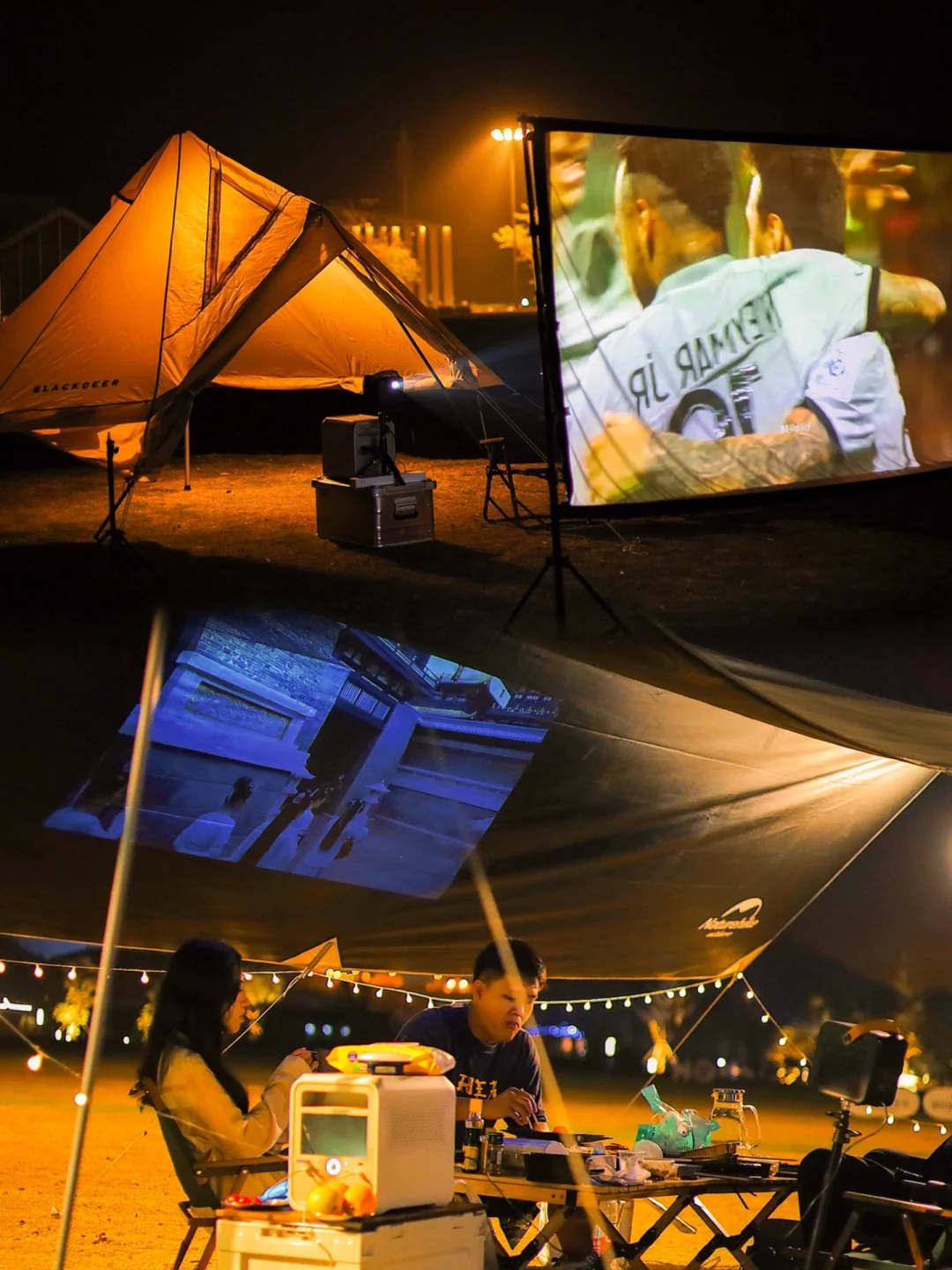 ✔️幕布|可选择架子或天幕杆风绳自搭,建议使用天幕杆风绳搭建的天幕更抗风。没有幕布的也可以用纯白色天幕当投影幕布(如图2下图),就是画面有点歪看着没那么舒服~