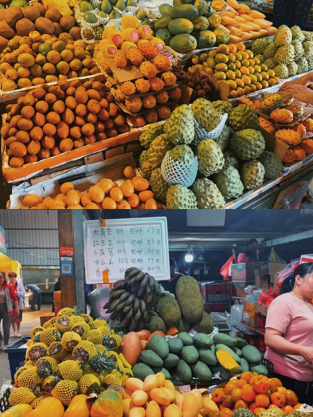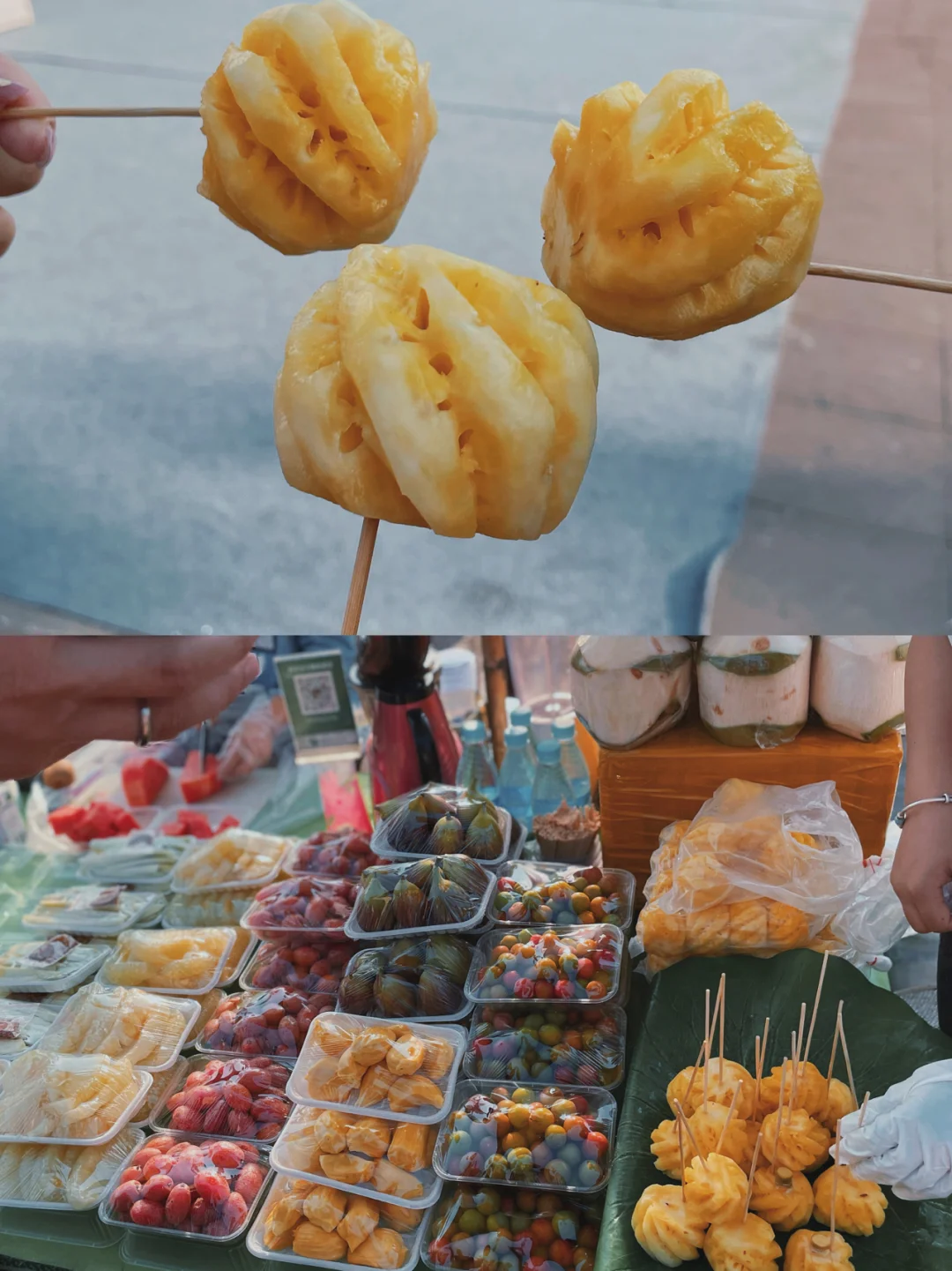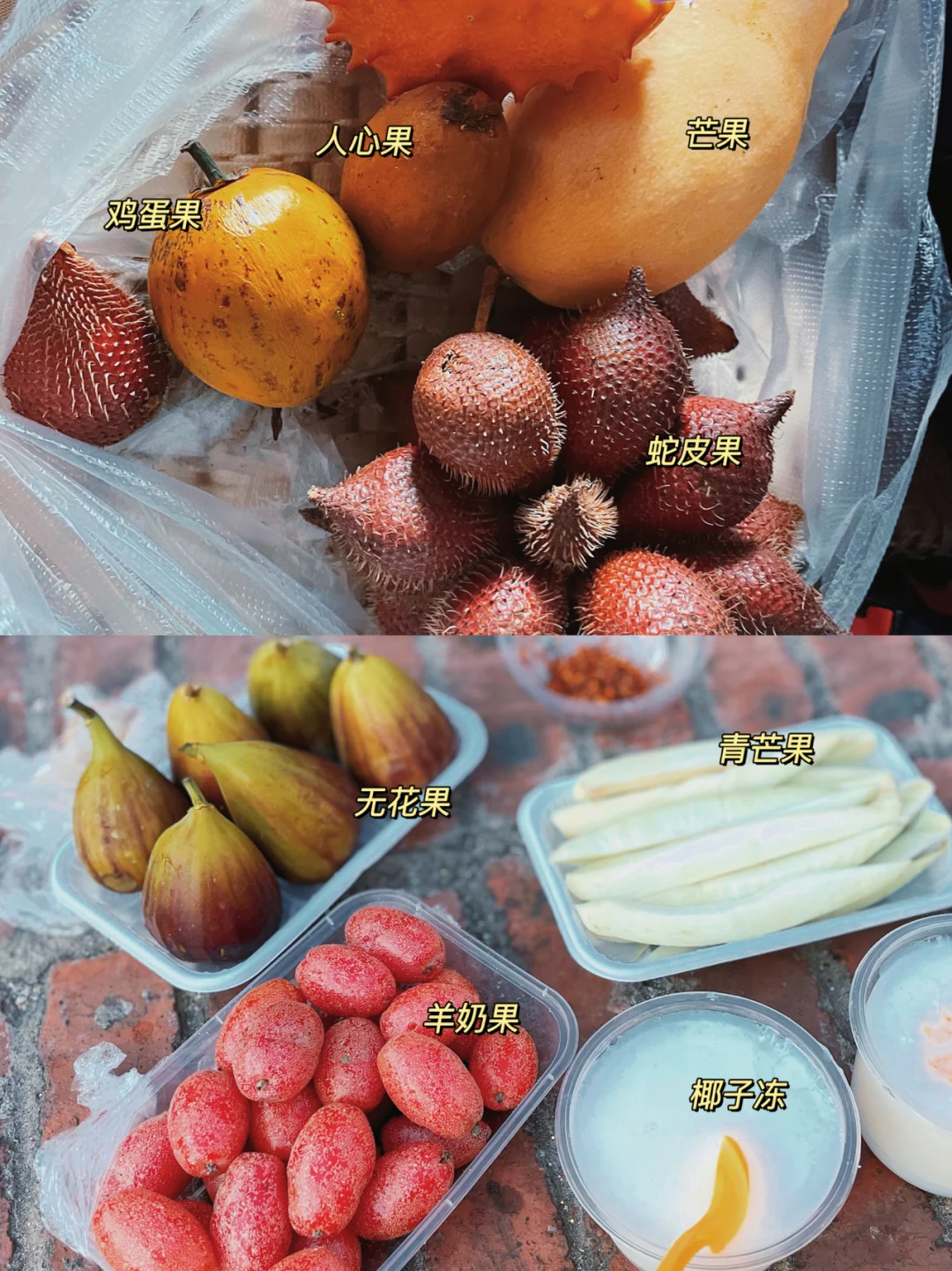 ▪️继上一篇西双版纳小吃主食美食篇后期,再来一篇热带水果试吃篇哦-~ ▪️我的水果购买地集中是在 星光夜市[地点]和 曼阁市场水果批发市场[地点] - ⚪️蛇皮果 ▪️10元一大串啦,外皮很像蛇的皮肤,还有很多刺,剥皮比较麻烦容易刺到手! ▪️味道酸酸甜甜,我也觉还不错 - ⚪️火参果 ▪️10元一个,让商家帮忙开好,然后还会倒入一包蜂蜜,然后给一根吸管给你吸的 ▪️但我觉得即使已经加了蜂蜜,感觉还是没什么味道,觉得一般 - ⚪️鸡蛋果 ▪️5元一个,果肉不仅颜色像蛋黄,连口感也好像,就是那种吃起来粉粉的质感 - ⚪️人心果 ▪️5元一个,咖啡色的外表,果肉有点像氧化的的苹果,颜值一般,但吃起来还是很甜的 - ⚪️羊奶果 ▪️夜市10元一盒,曼阁市场没有这玩意卖 ▪️贼酸,酸到我们每个人都面目狰狞了~不推荐❌ ▪️不过我觉得还是可以买一盒回去做手信,戏弄一下朋友,哈哈哈哈 - ⚪️小菠萝 ▪️10元4个,超级好吃超级甜,必须买!! - ⚪️椰青 ▪️10元一个,不过不失吧,微酸偏甜,但感觉没有平时在网上买的泰国椰青甜 - ⚪️无花果 ▪️10元一盒,一盒有6个,很大一盒 ▪️不知道是不是我手气不好,感觉我那几个无花果都没熟,没有水分也没有甜味,差评 ⚪️青芒果 ▪️10元一盒,如果单吃会有点酸,蘸上辣椒粉,还挺好吃的 - ⚪️释迦 ▪️这里到处都有卖,一定要挑有点软的才是熟的哦 ▪️白色的果肉甜甜的,但是超级多核,吃着有点累 - ❤️关于更多西双版纳详情🔎请看前几篇笔记 📒西双版纳五天四夜行程攻略 📒西双版纳美食测评篇 📒西双版纳民宿篇 📒西双版纳199元傣族写真篇 - 云南|西双版纳旅游攻略|西双版纳景点|西双版纳行程|西双版纳美食攻略