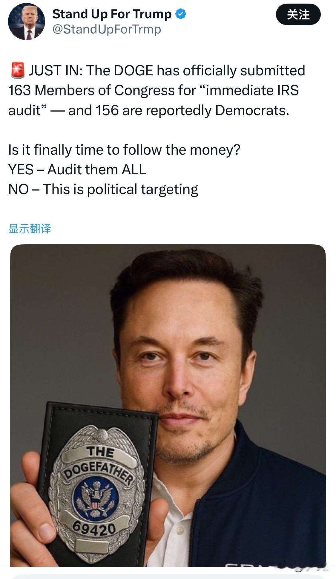 最新消息:特朗普内阁的政府效率部(DOGE) 已正式提交 163 名国会议员接受美国国税局立即审计,而且是全部审计——据报道,其中 156 人是民主党人。 这就是为什么他们不喜欢政府效率部的原因。