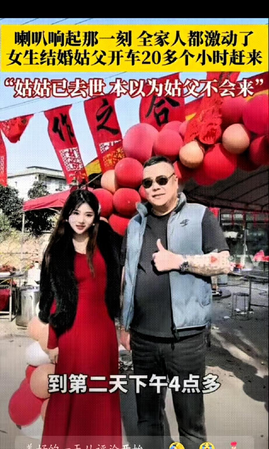 真的忍不住鼻酸!河南驻马店的女生要结婚了,可最疼她的姑姑离世,这份喜悦里总少了点最亲的牵挂。她犹豫了好久才微信邀请姑父,其实打心底没抱希望:姑父要在家照顾年迈的奶奶,还要照看未成年的弟妹,家里一堆事,路途又远,姑父一开始也婉拒说“可能抽不开身” 可婚礼前一天下午,院子里突然传来一声车鸣,女生抬头的瞬间,眼泪直接掉了下来——竟然是姑父的车!他风尘仆仆地从千里之外赶来,脸上还带着20多个小时长途驾驶的疲惫,手里拎着简单的行李,却笑着说“侄女一辈子就结一次婚,我咋能不来”。 全家人瞬间围上去,又惊又喜,眼眶都热了。网友的评论戳中了无数人:姑父的“父”是父亲的父,女生微信里备注的“姑爸”,藏着的是双向奔赴的真心实意。 他哪里是来参加一场婚礼?是替已故的姑姑,亲眼见证侄女最幸福的瞬间;是告诉女生,哪怕姑姑不在了,她的身后依然有人撑腰;更是用行动兑现了对姑姑的承诺,会一辈子护着她的家人。 婚礼的奢华排场终会褪色,贵重的礼金也会被遗忘,但这份跨越千里的牵挂、排除万难的奔赴,却能暖一辈子。真正的亲人,从不是血缘注定的羁绊,而是把你的事当成自己的事,把你的重要时刻,看得比什么都重。 生活里最动人的从来不是轰轰烈烈的誓言,而是这种藏在细节里的偏爱与坚守。你身边有没有这样“非血缘却胜似亲人”的温暖?