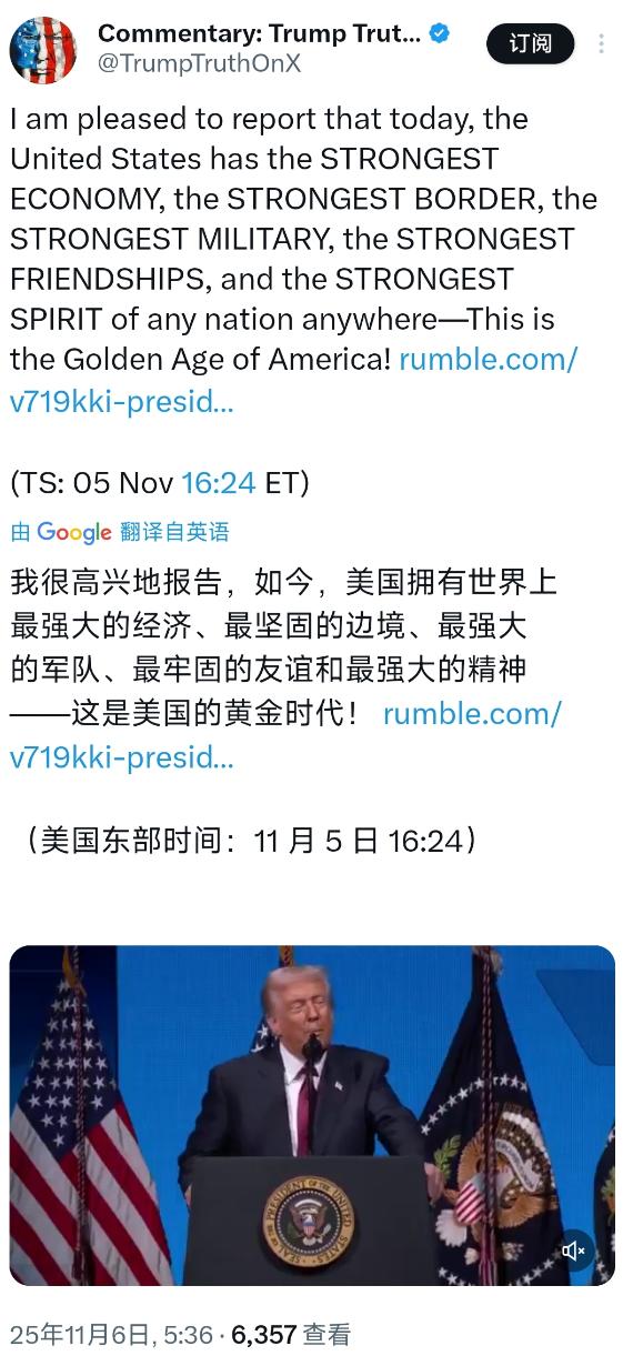 特朗普北京时间 11 月 6 日表示:“我很高兴地报告,如今,美国拥有世界上最强大的经济、最坚固的边境、最强大的军队、最牢固的友谊和最强大的精神 - 这是美国的黄金时代!” 这话听着挺唬人,可惜刚说完没两天,现实就狠狠抽了个大嘴巴。就在他说这话的前一天,美国联邦政府停摆已经进了第 35 天,刚好追平了历史最长纪录,所谓的 “黄金时代”,先从一场政府关门的闹剧开始了。 所谓 “最强大的经济”,现在看更像自欺欺人。穆迪的经济学家早说了,本来美国经济就脆得很,政府一停摆,麻烦来得比谁想的都快。 国会预算办公室算过账,停摆 4 周经济就少 70 亿美元,要是拖到 8 周,损失能飙到 140 亿,四季度 GDP 增长率直接得掉一两个百分点。 这还不是最糟的,毕马威的专家说这影响跟滚雪球似的,越滚越大,雇主不敢投资也不敢招人,有些企业干脆直接上 AI 替代人工,裁员潮悄没声儿就来了。 嘴上说经济强大,可实际上连正经的就业岗位都没创造几个,新增的那点工作,说不定过阵子就没了。 老百姓更关心的是信用卡账单和学生贷款能不能按时还,谁会因为股市里人工智能的股票涨了就觉得日子好过了? 再说说 “最强大的军队”,这说法现在听着都有点滑稽。美军每年得招十五万新兵才能补上空缺,可现在兵源早就跟不上了。17 到 24 岁的年轻人里,七成以上因为肥胖、吸毒、心理问题或者没学历,根本没资格当兵。 算下来,全国 2000 多万适龄年轻人里,只有 2% 的人同时满足学历、健康和参军意愿这几个条件,这点人连塞牙缝都不够。陆军这两年的征兵目标一降再降,就算这样还不一定能完成。 为了招人,五角大楼每年花 5 亿美金搞宣传,结果弄出来的卡通征兵广告被网友骂惨了,跟别的国家一对比,有人直接说 “我们完蛋了”,后来甚至整出 “用星座决定军队角色” 的荒唐说法,这哪像个强大军队该有的样子? 至于 “最牢固的友谊” 和 “最坚固的边境”,现实里也没多少底气。国内的烂摊子都收拾不过来,哪还有精力维系所谓的 “牢固友谊”。 而民生层面的困境早就堆成了山,政府一停摆,41 个州的 6.5 万儿童连 “开端计划” 的托管服务都要没了,低收入家庭本来就难,这下更是雪上加霜,不少妈妈因为没人看孩子,连班都上不了。 那些靠 “补充营养援助计划” 过日子的家庭,现在连下一顿饭在哪都没谱,本来通胀就没过去,政府援助一延迟,日子直接过不下去。 所谓的 “最强大的精神”,更像是空中楼阁。社会里的裂痕越来越大,贫富差距把人分成了两半,富的盯着股市涨,穷的愁着账单愁。 年轻人里七成过不了征兵体检,要么胖得走不动路,要么沾了毒品,要么连高中文凭都没有,这样的群体能撑起什么 “强大精神”?政府停摆本就是人为制造的麻烦,却让普通老百姓买单,信心早就一点点磨没了。 经济学家都警告,再这么拖下去,消费者、企业、投资者的信心全得崩,股市震荡下跌只是开始,要是停摆过了感恩节,经济想恢复都难。 特朗普嘴里的 “黄金时代”,更像是把滤镜拉到最大的自拍照,只敢看自己想看到的部分,压根不敢面对镜头外的一地鸡毛。 政府停摆创纪录,经济损失天天涨,当兵的人招不上来,孩子没人管,老百姓愁生计,这些实打实的问题就摆在那,哪一样都跟 “黄金时代” 搭不上边。 说白了,这不过是又一场自吹自擂的表演,可惜现实太清醒,根本不给圆谎的机会。所谓的 “最强大”,更像是怕别人看穿底气不足,故意喊出来的壮胆话。 真要是黄金时代,也不至于让几千万人在政府停摆的阴影里发愁,更不至于连招兵都成了老大难。这话骗骗自己还行,往外一说,只会让人看清这 “黄金时代” 到底有多虚。 参考文章:菲常视野陈菲 11.06 特朗普今天(北京时间11月6日)表示:“我很高兴地报告,如今,美国拥有世界上最强大的经济、最坚固的边境、最强大的军队、最牢固的友谊和最强大的精神 -这是美国的黄金时代!”