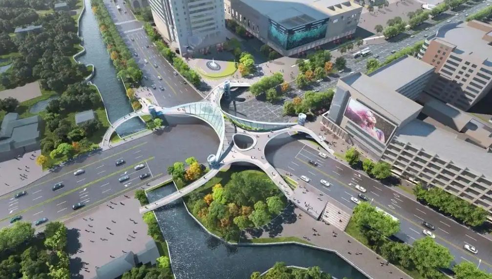 西门过街天桥设计延续了济南“静荷舞柳”的景观基因,并以“X”形流畅曲线展现现代济南“开放、交流”的城市氛围。西北角与西南角的步道跨越护城河,有效连接五龙潭与趵突泉景区,并在趵北路沿线衔接护城河绿道。东北角与东南角则直通泉城路,成功串联起城市旅游目的地与城市综合消费目的地。