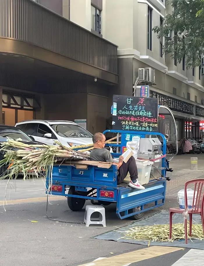 此人应该是小商贩界的天花板了。 网友拍到一出售甘蔗的小贩,在没有生意的时候,安静地半躺在三轮车上看着一本厚厚的书。在三轮上挂着一小块黑板,上面的文字显示出这个商贩的与众不同。 街头巷尾,卖甘蔗的小贩随处可见,但这位小贩却格外与众不同!网友拍下他没生意时,半躺在三轮车上静静看厚书的画面,三轮上还挂着一块别致黑板,瞬间引发热议。 在这个快节奏时代,多数小贩忙着吆喝招揽生意,他却沉浸在书的世界里。那块黑板上的文字,或许正是他内心世界的写照,彰显着他的与众不同。有人觉得他是在摆拍博眼球,可仔细想想,在忙碌营生中还能坚持读书,本身就是一种难能可贵的品质。 他或许明白,生活不止眼前的苟且,还有诗和远方。即便身处市井,也不放弃对知识的追求。这种在平凡中坚守自我的精神,值得我们每个人学习。 大家觉得他是真读书还是在作秀?如果是你,能在忙碌生活中抽出时间看书吗?快来评论区说说你的看法。[给力]