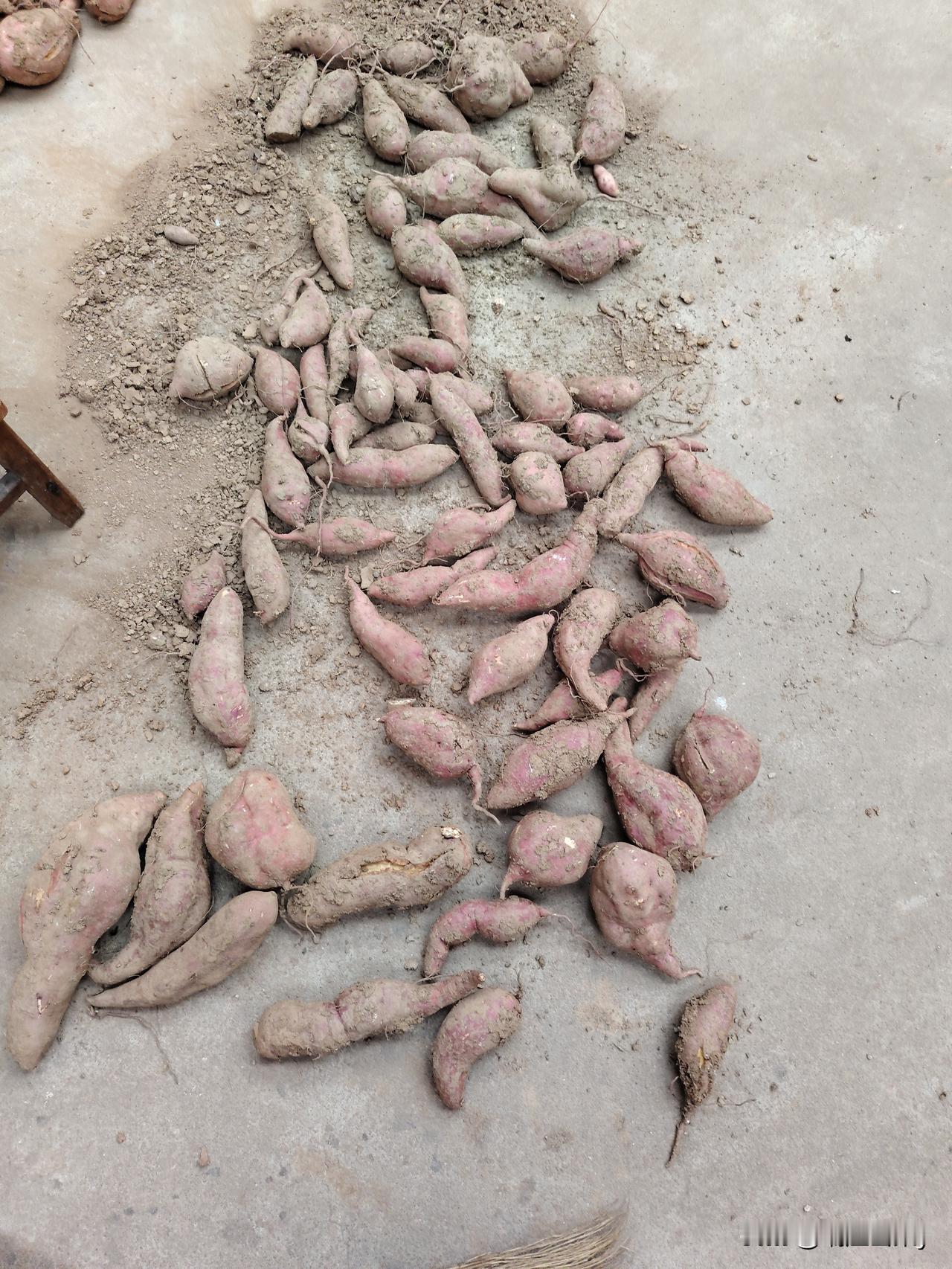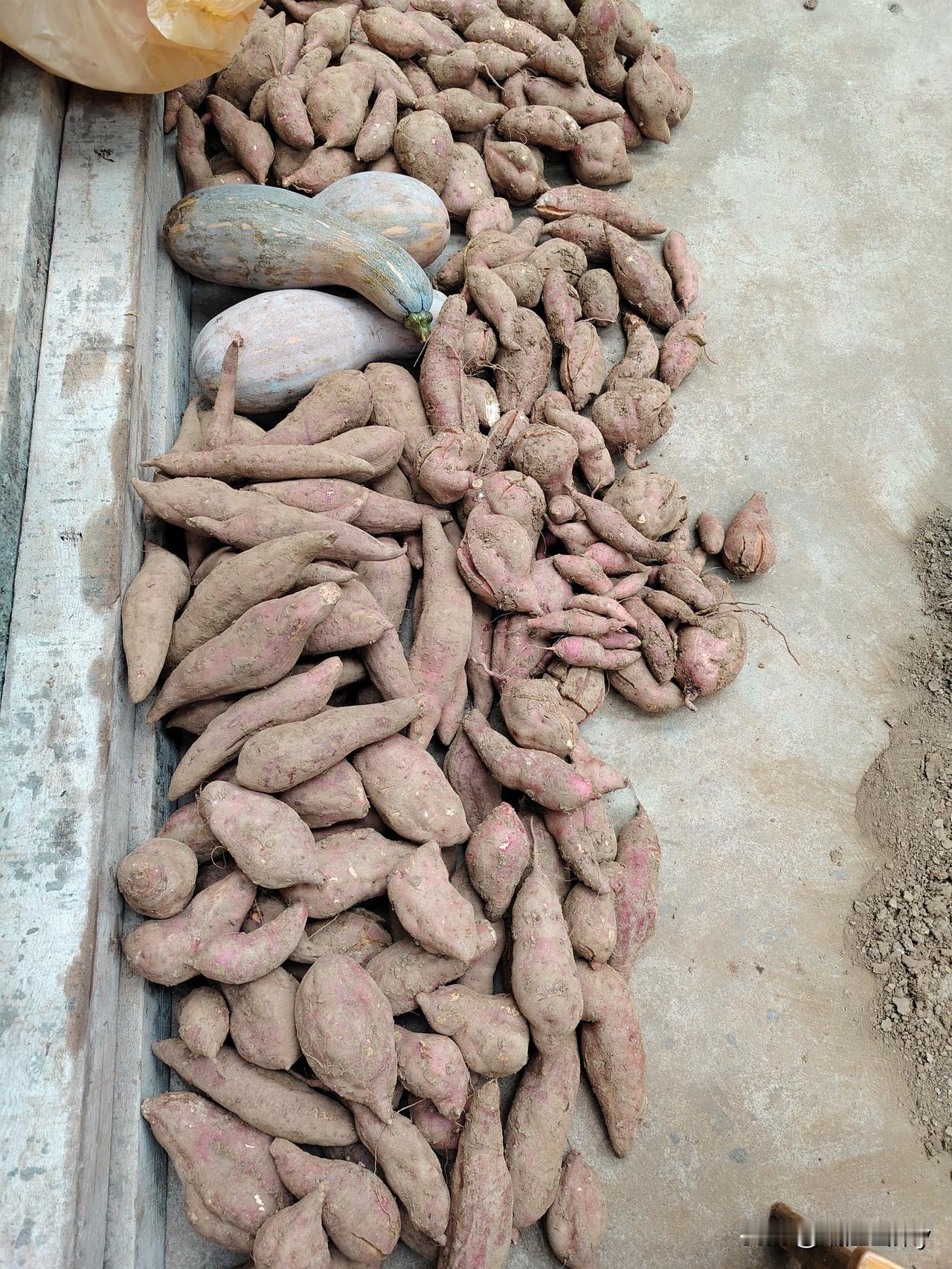 前两天挖回来的红薯,挖回来以后连泥巴带根须囫囵放在院子里晾着,这几天老是下雨,潮气很大,我就是每天就翻一下,还好表皮上的泥巴开始干得脱落一些,但是有极少数还是泥巴干在上面不掉下来。 今天就开始清理一下,发现有那种炸了口的红薯上面有一层白色的东西,用手指一按就往外冒泡了,看来是不通风坏掉了。 这些红薯和南瓜也是种着预备给三条狗狗来吃的,也不用太在意它们的外形了,一个星期以后估计就吃完了吧! 整理一下看着顺眼多了。