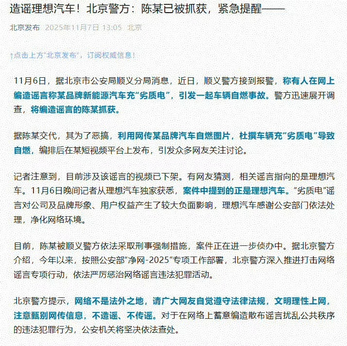 据报道,谣言所指某品牌新能源汽车充“劣质电”为理想汽车,“劣质电”谣言对公司及品牌形象、用户权益产生了较大负面影响。理想汽车所遭遇的恶意造谣,也不是个别企业所面临的情况,而是整个新能源汽车行业都必须面对的严峻挑战。