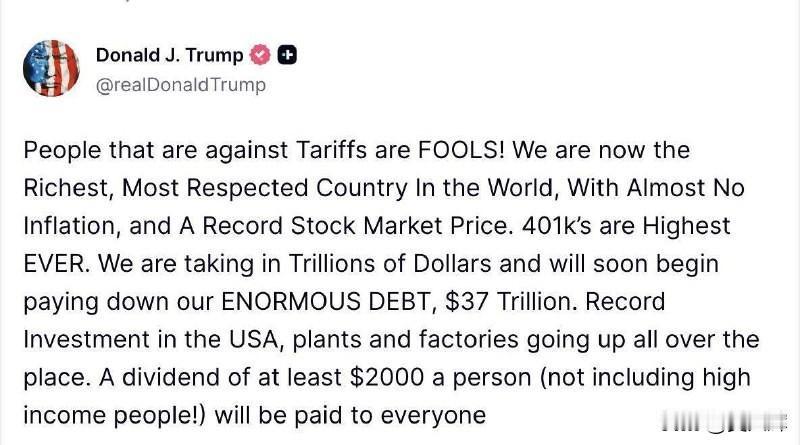 特朗普宣称,每位美国人都将从美国通过征收关税获得的收入中,领到2000美元。 他表示,当前美国是“全球最富有、最受敬重的国家”——通胀率几乎为零,股市创下历史新高,投资持续增长。 特朗普还称,政府通过关税已获得数万亿美元收入,并计划不久后启动37万亿美元国债的偿还工作。