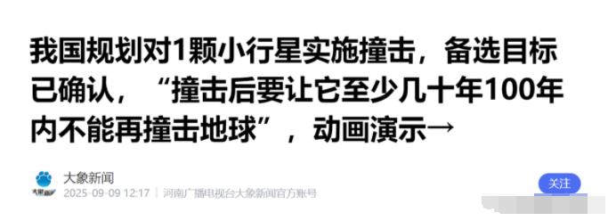 如果真的成功,中国航天将会超越所有神话!最新消息显示,中国将执行一项前所未有的深空任务——在离地球一千万公里的地方,用一次精准到发丝的撞击,把一颗直径约五十米的小行星轨道推偏三厘米。   别嫌这三厘米不起眼,这可是人类护着地球的关键一步,更能看出中国航天的硬实力有多顶。 估计有人要问了,费这么大劲撞小行星,图个啥?你翻翻“太空事故”记录就懂了,6500万年前,一颗小行星直接把恐龙从地球霸主的位置给掀下去了;1908年的通古斯大爆炸,能量相当于1000颗原子弹,把2000平方公里的森林烧得一干二净;2013年车里雅宾斯克的陨石雨,差点把一座城市搞瘫痪。   这些都不是瞎编的传说,是真真切切悬在咱们头顶的“太空刀子”。就说这次要撞的五十米级小行星,真要是往地球冲,威力堪比几十颗核弹,一座中型城市都能被它抹平。中国这次动手,就是提前练本事,给地球装个“防撞气囊”。   这事儿看着简单,实际比登天还难。第一步就得“找得到”,一千万公里外的小行星,在太空里就跟大海里的一粒沙子似的。   好在咱们早有准备,2022年就开始建“中国复眼”深空雷达,这玩意儿就像个超级望远镜,能把深空里的小目标看得明明白白,相当于给小行星装了24小时监控。到2023年,防御小行星直接被列进航天八大行动,从盯梢到做计划,每一步都踩得特别稳。   比找目标更难的是“撞得准”。科学家都把这任务比作“太空穿针”:航天器得带着撞击器飞一千万公里,快到小行星跟前时,撞击器得以每秒6.5公里的速度冲出去——这速度比子弹快几十倍,一眨眼的功夫就能飞出去好几公里。   更麻烦的是,小行星长得歪歪扭扭,还在不停转,撞偏一丁点儿都不行:擦着边撞可能只让它原地打转,撞错位置更是白忙活。这就全靠航天器自己“认路”“瞄准”,用的是超高精度的自主导航技术,差不多等于让无人机在暴雨里精准砸中一个飞着的乒乓球。   别觉得这三厘米不值当,这里面学问大了去了。小行星在太空里飞得特别快,现在偏三厘米,时间越久偏差就越大,往长远了说,就能彻底让它避开地球轨道。中国探月工程总设计师吴伟仁都说了,这就是为了验证“撞一下就能改轨道”这技术好不好使,毕竟在地面上模拟一百次,都不如真去太空撞一次实在。   而且咱们这任务,比美国之前的DART任务还厉害:美国当时只能靠地面望远镜看撞得怎么样,咱们的主航天器会带着设备近距离盯着,撞击坑多大、喷出来的碎石多快,这些细节都能记下来,拿到的数据在全世界都是独一份的宝贝。   有人担心,会不会一撞把小行星撞得朝地球飞过来?完全不用慌。科学家早把安全账算得明明白白了,这次挑的小行星本来就不会撞地球,一千万公里的距离,比咱们到月球远二十多倍,怎么撞都不会把它引到地球来。   反而借着这次“主动敲一敲”的实验,能摸清楚小行星里面是啥结构,就像买西瓜时敲一敲听声判断熟没熟,以后真遇到危险小行星,就能算准该用多大劲儿去推它。   这事儿的价值可不光是“防撞击”。小行星算是太阳系的“老古董”,里面藏着太阳系刚形成时的秘密,还全是铁、镍这些值钱的资源。离近了观察,能帮咱们解开不少科学谜题,甚至为以后去小行星上“挖矿”打基础。更重要的是,把这任务干成了,说明中国在深空导航、远距离通信这些尖端技术上都突破了,以后搞更复杂的深空探测,底气就更足了。   从“中国复眼”盯着深空,到把防御小行星写进航天规划,再到定好2027年的撞击任务,中国航天每一步都走得特别扎实。这可不是在这儿炫技术,是真真切切为人类守家园,咱们到时候拿到的所有数据,都会跟全世界分享,帮着大家一起建地球的“防护网”。   神话从来不是用来抬头看的,是用来亲手打破的。等中国航天器在千万公里外完成那记精准撞击,中国航天就会成为新的传奇。
