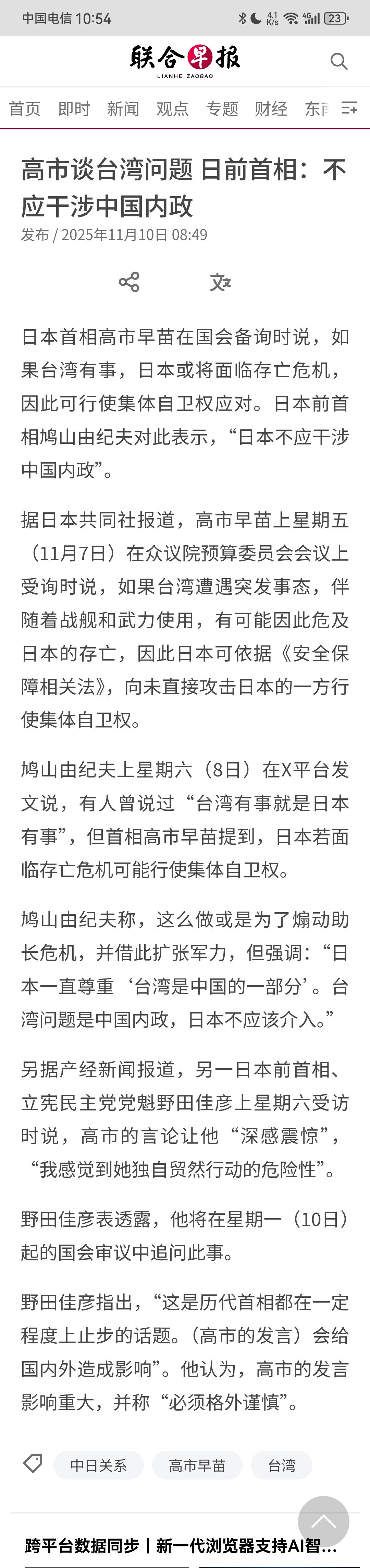 已经有两名日本前首相都站了出来批评高市早苗了。联合早报11月10日报道说,在高市早苗做出“如果台湾有事,日本或将面临存亡危机”这个发言之后,日本前首相鸠山由纪夫直接就毫不客气在社交平台上批评高市早苗,说她这么做是为了煽动助长危机,并借此扩充军力,随后更是亲自表态,说:“日本一直尊重‘台湾是中国的一部分’,台湾问题是中国内政,日本不应该介入。” 随后,另一位日本前首相野田佳彦在接受采访时,也毫不客气批评了高市早苗,说高市早苗这个言论让他深感震惊,而后他更是表态说后续会在10月10号的国会审议之中亲自追问此事! 高市早苗的言论一发出,直接两位日本前首相都站了出来,纷纷严厉批评,由此可以说明日本还是有明白人的,高市早苗的发言完全不负责任,产生了极大负面影响,这样的言论只会让日本陷入一条死路,现在高市早苗应该做的,就是赶紧道歉,看是否能够挽回局势,否则说不定都用不着我们出手,她这个日本首相的位置就要被那些胆战心惊的日本政客给掀下去。 要知道,高市早苗之所以能够选上日本首相,也是有一定运气因素,她的执政根基并不稳,国会呈现出朝小野大的局面,在野党的国会席位很多,都虎视眈眈盯着她,现在她又犯下了如此严重的错误,这些在野党如果不利用这个机会,怎么都说不过去。天欲使其灭亡,必先使其疯狂,高市早苗的做法,不仅会让日本遭殃,最后多半也会彻底葬送她自己的前途。