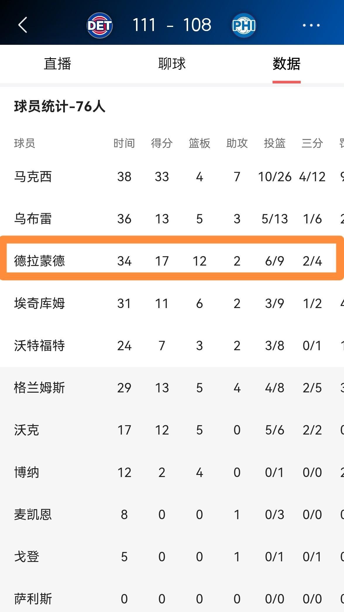 76人老将德拉蒙德真是不得了啊!虽然今天76人在主场以108:111惜败于活塞,但是德拉蒙德打出了让人非常惊喜的表现。 全场比赛下来,德拉蒙德首发出战34分钟,投篮9中6,其中三分球4中2、罚球4中3非常高效的得到17分12篮板2助攻1抢断1盖帽0失误。 本场比赛德拉蒙德最让人感到欣喜的地方在于,他出人意料的投进了两记三分球。