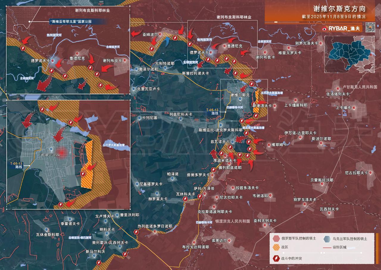 🚩谢维尔斯克方向 截至2025年11月8至9日的情况 在谢维尔斯克方向,俄军部队正巩固在新解放的德罗诺夫卡地区的控制。若干步兵分队正试图沿北顿涅茨克河河道向西南方向的普拉托诺夫卡推进,并对05-13号公路实施火力压制。此举将能切断北顿涅茨克守军的主要补给路线之一。 📌与此同时,突击群正在居民点以西突破敌军防线。不久前该城最后一道防线的战斗已经打响,俄军在此区域已清除多个支撑点。在该方向的南翼,兹瓦诺夫卡地区的战斗仍在持续。 ❗️乌军作战单位在该村庄仅部署少量步兵小组,但密集的无人机群仍在阻碍俄军突击部队的推进。 俄乌冲突新局势俄军最新进展热点观点 来源:RYBAR_渔夫