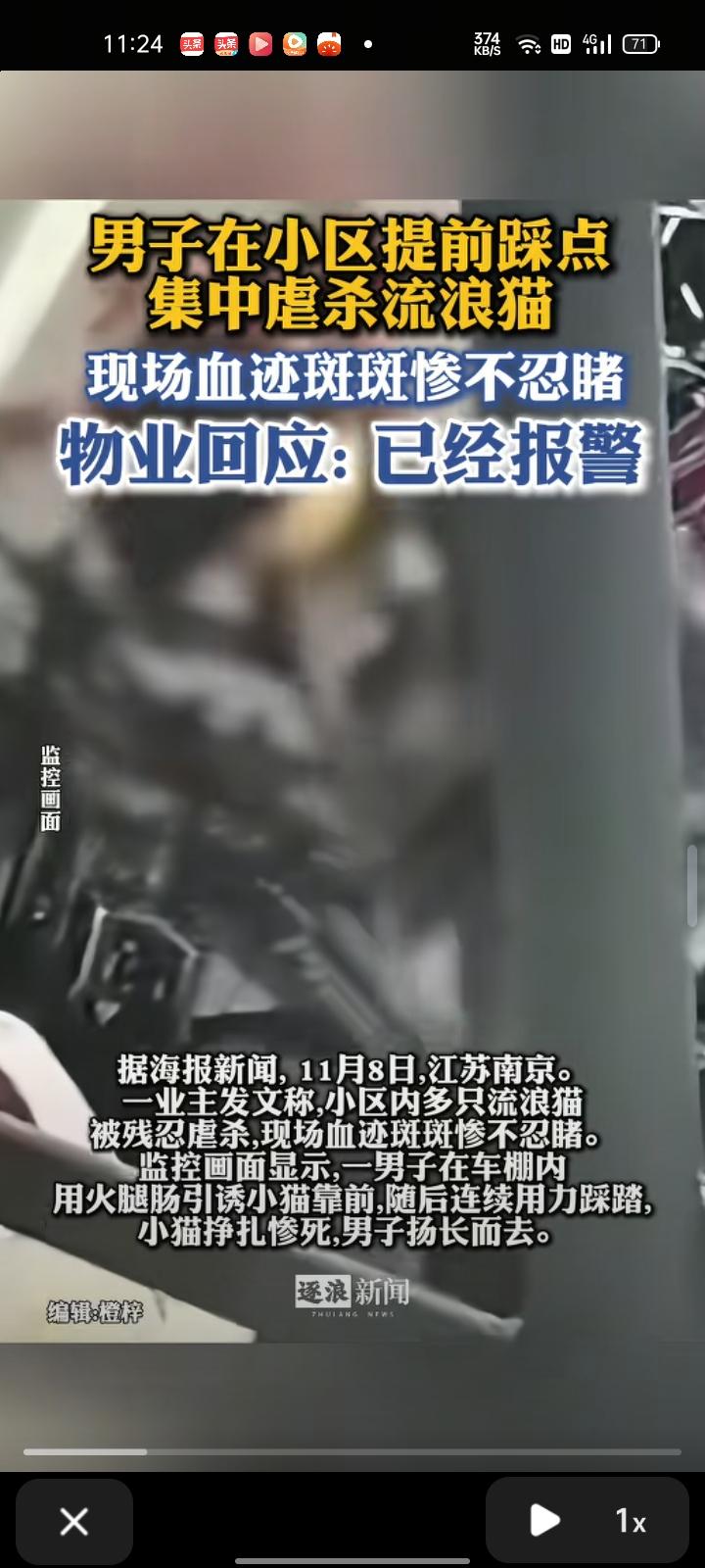 11月8日,江苏南京。业主发文称,小区内多只流浪猫被残忍虐杀,现场血迹斑斑惨不忍睹。监控画面显示,一男子在车棚内用火腿肠引诱小猫靠前,随后用力踩踏,小猫挣扎惨死,男子扬长而去。 据业主核查监控发现,该男子在小区内提前踩点,随后集中对多只猫实施虐杀,目前已确认四只流浪猫遇害。 小区物业回应称,已报警,不确认男子身份。 这种行为不仅是对生命的漠视,更是一种极端的暴力行为,他这次恐怕是要被警方拘留了。 猫也是一种生命,虐猫行为折射出的是对生命的冷漠与潜在的暴力倾向。我们不能仅停留在愤怒和谴责,更应通过法律途径、社会监督和教育引导,让尊重生命成为共识。当更多人愿意为无声的生命发声,这样的悲剧才会逐渐远离我们的社会。