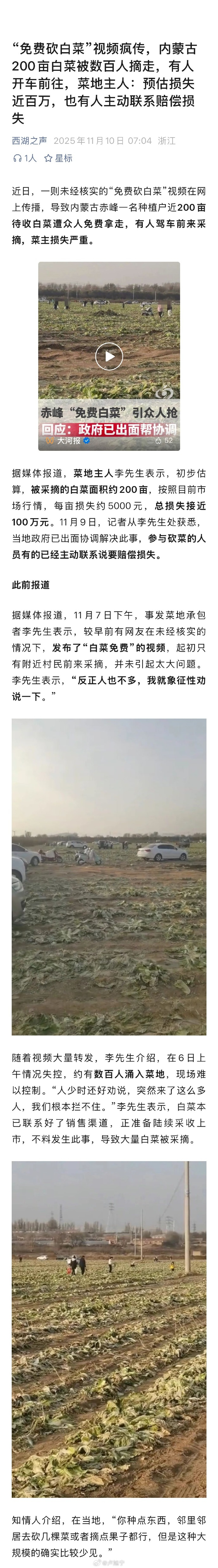 过分了,发布“白菜免费”视频,引得众人哄抢,菜农的损失谁来担!11月6日,内蒙