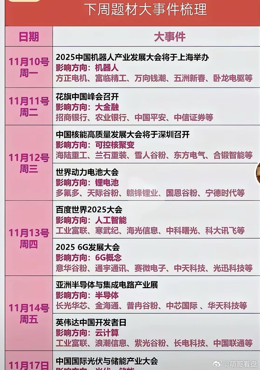 总结:11月题材主线清晰,科技(AI/6G/机器人)+能源(核能/锂电/光伏) 是核心赛道,建议重点跟踪产业大会的技术突破与政策信号,把握细分领域龙头的波段机会。