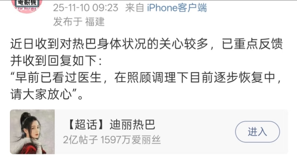 对接回应热巴身体状况:早前已看过医生,在照顾调理下目前逐步恢复中,请大家放心!