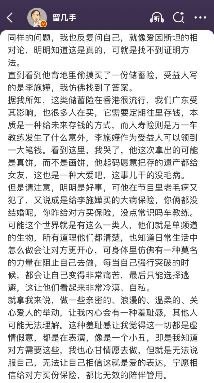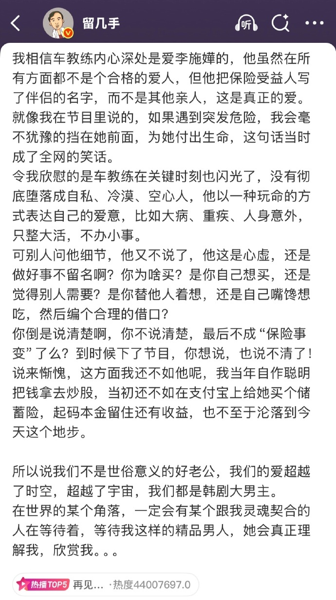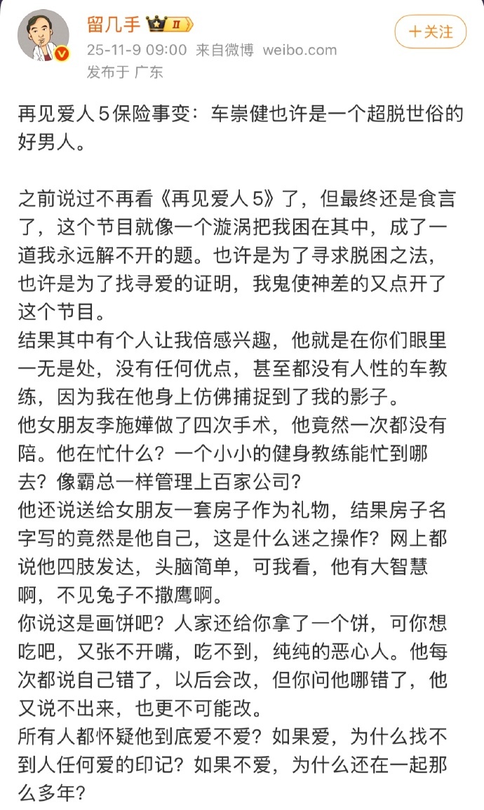 留几手锐评再见爱人保险事件想起当年手哥吐槽彩礼=卖女儿,面对车崇健的神奇操作,也是表现出了理解和认可…不过看完他发的内容,确实也有几分道理。不管怎么样,钱都是绕不开的话题,真应了那句话,钱在哪儿爱在哪。伴侣四次手术都没有拿钱的车崇健,买保险都是为自己买的车崇健,真的配不上她…