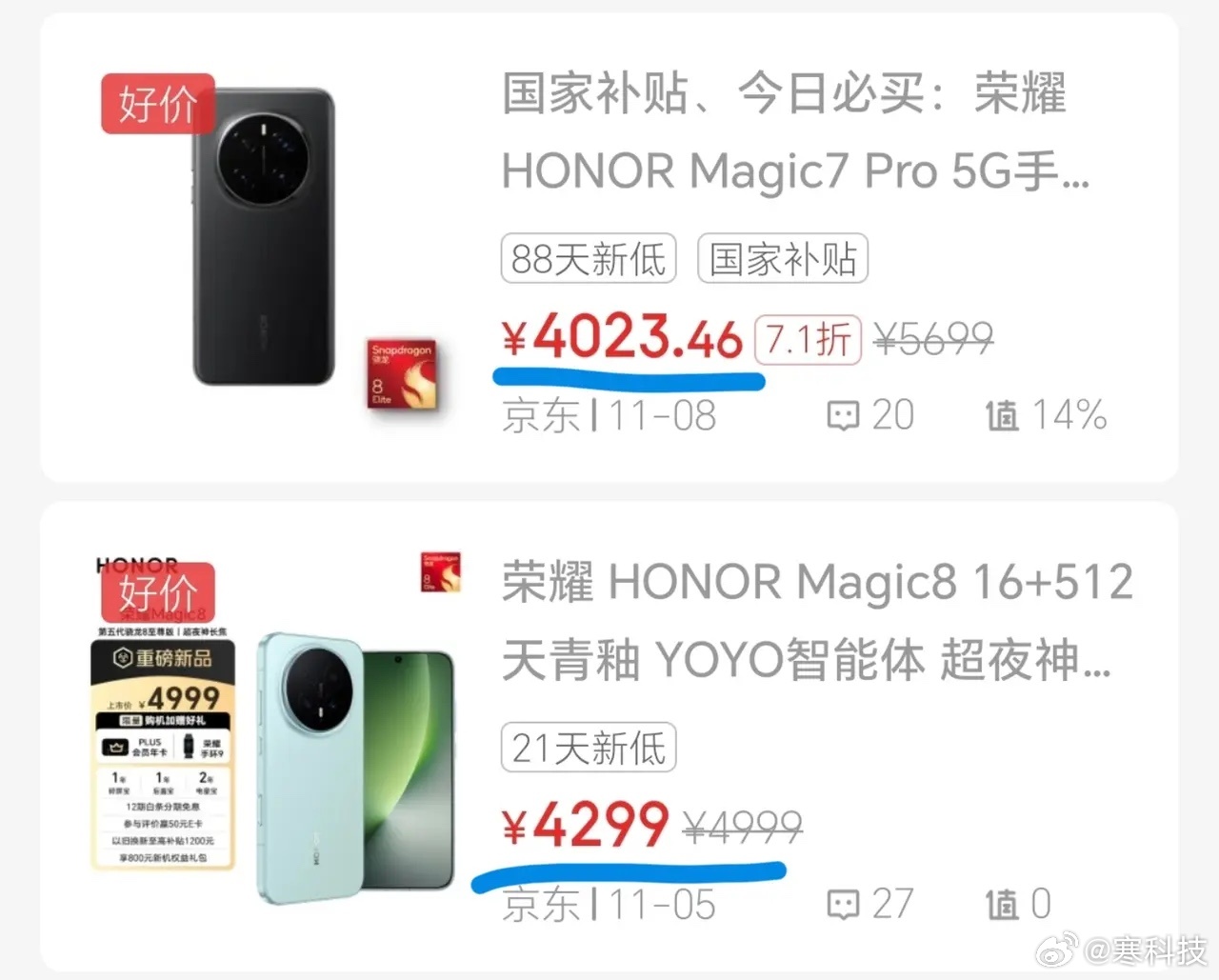 荣耀Magic7 Pro和荣耀Magic8现在价格差不多,还真的会让人选择犯难,不过从长远来看还是推荐Magic8系列,毕竟有强的性能和更大的电池。