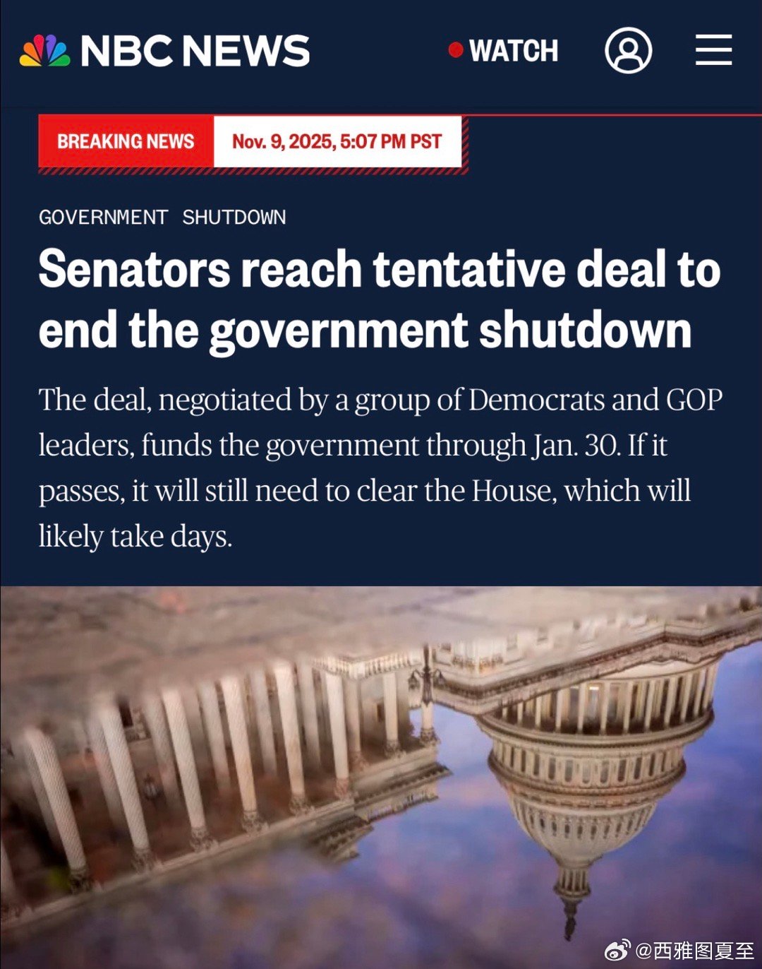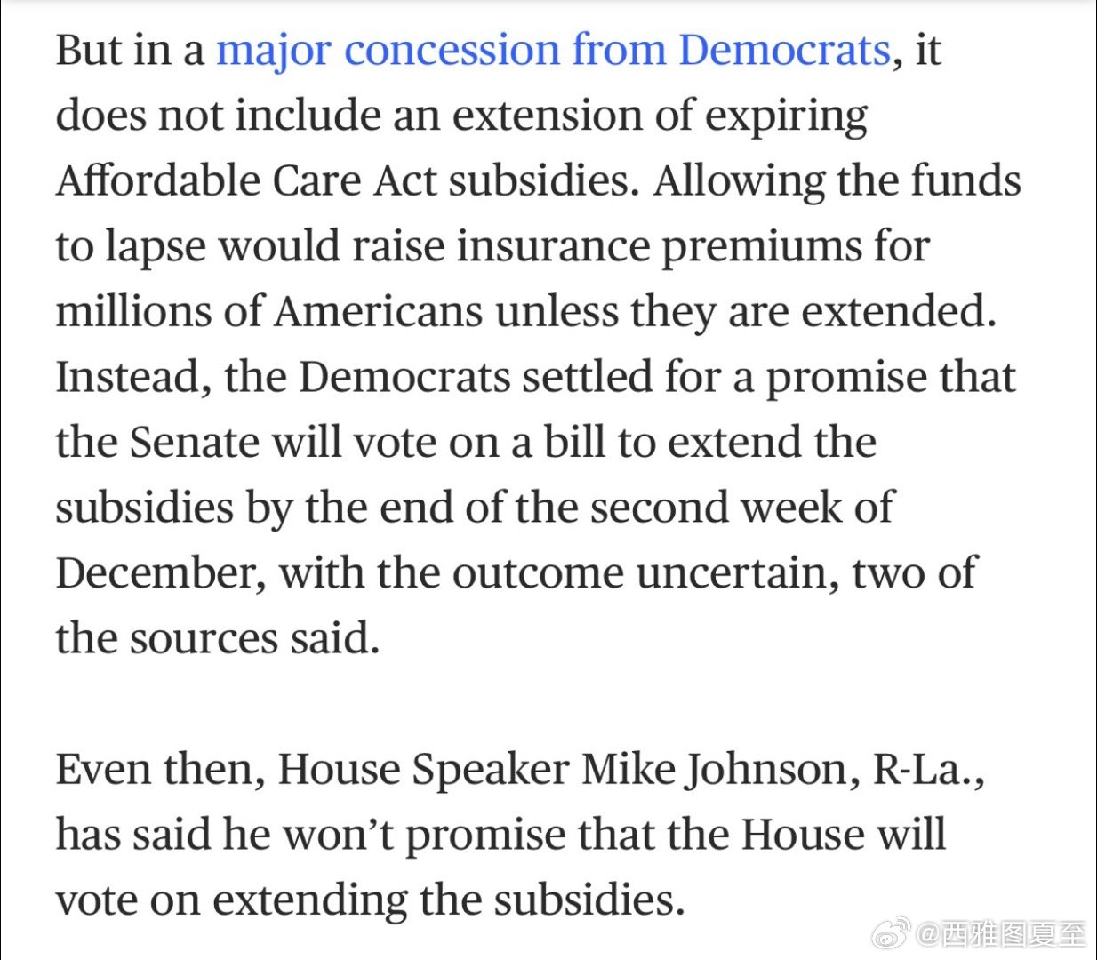 * 参议院下月的前两周,就“医保补贴再续一年”进行投票(没有保证一定能通过;众议长没有承诺众院一定会就此投票)