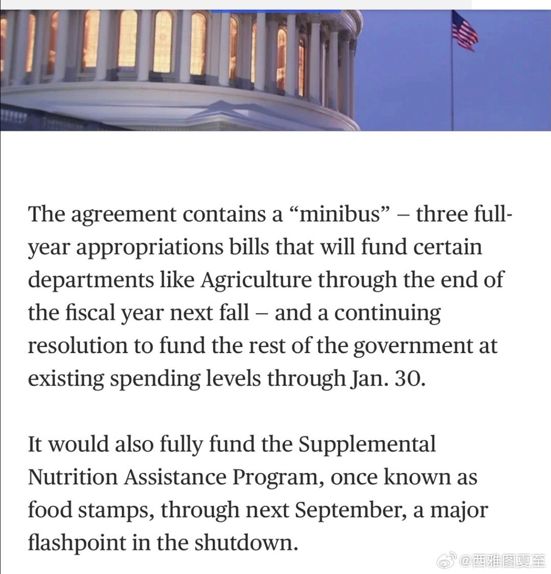* 农业部、食物券、母婴保健补贴、退伍军人福利、国防建设项目、国会开支等,拨款保障到明年九月底(财年结束)