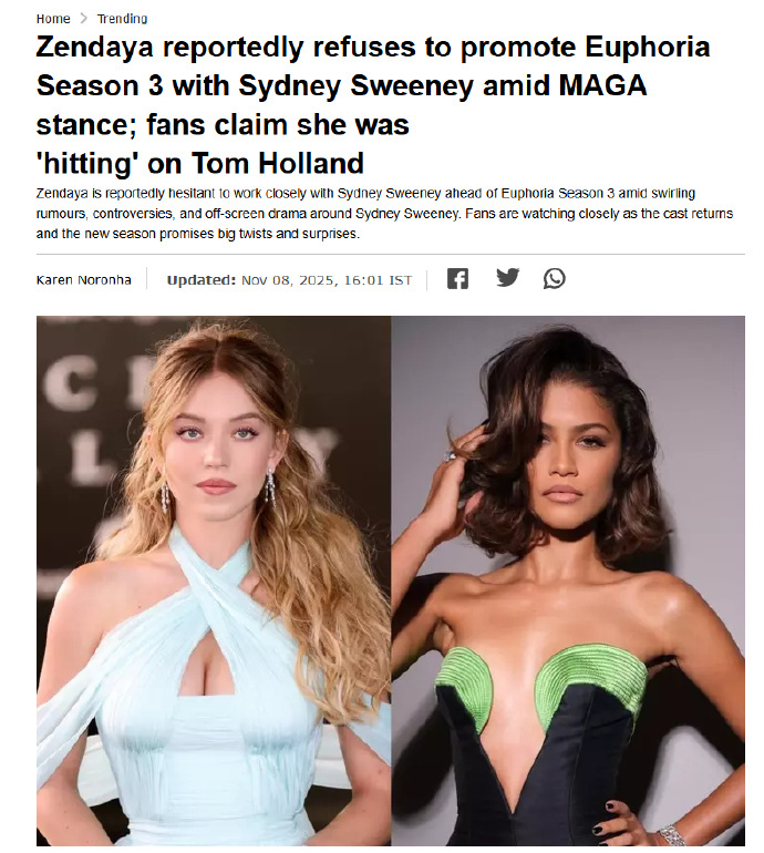 “她拒绝合作完全可以理解。Zendaya 的处境很尴尬,因为哪怕她只是和 Sydney 一起站在红毯上,外界也可能会解读为她在为 Sydney 支持特朗普、以及她拒绝为那个涉嫌种族歧视的广告道歉而开脱。”