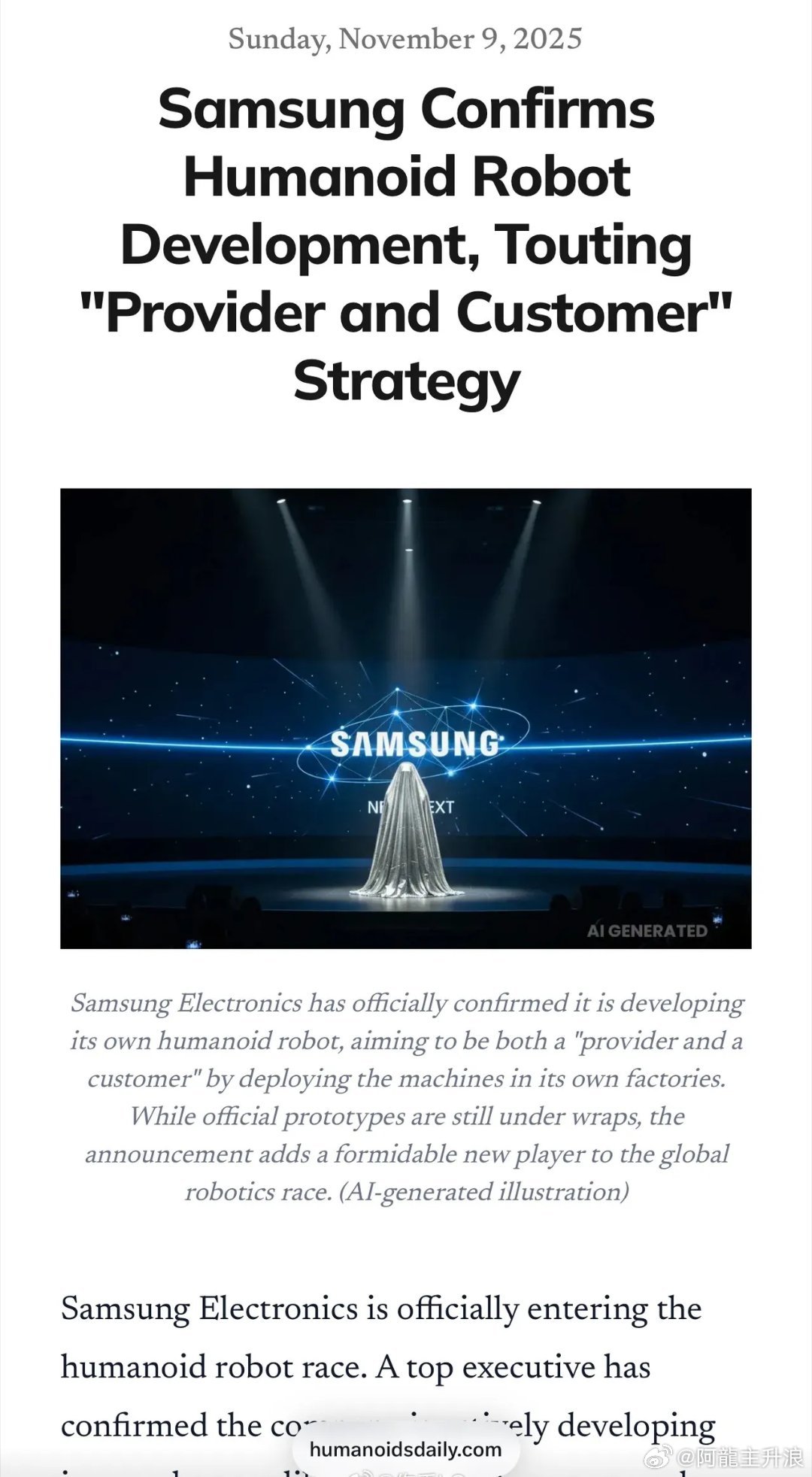 虽然人形机器人市场仍处于"早期阶段",但三星认为工厂环境中对这类机器人有重大需求。