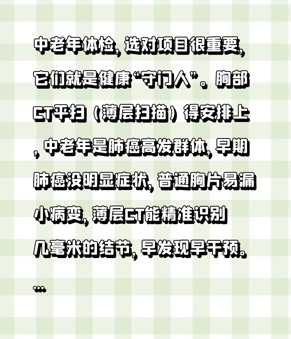 中老年体检,选对项目很重要,它们就是健康“守门人”。 胸部CT平扫(薄层扫描)得安排上,中老年是肺癌高发群体,早期肺癌没明显症状,普通胸片易漏小病变,薄层CT能精准识别几毫米的结节,早发现早干预。 13碳呼气试验也不能少,肠胃功能弱的中老年人适合做,吹口气就能检测幽门螺杆菌,这菌和胃炎、胃癌等有关。 颈部动脉彩超(8根血管)能评估血管情况,及时发现斑块和狭窄,预防脑梗中老年体检