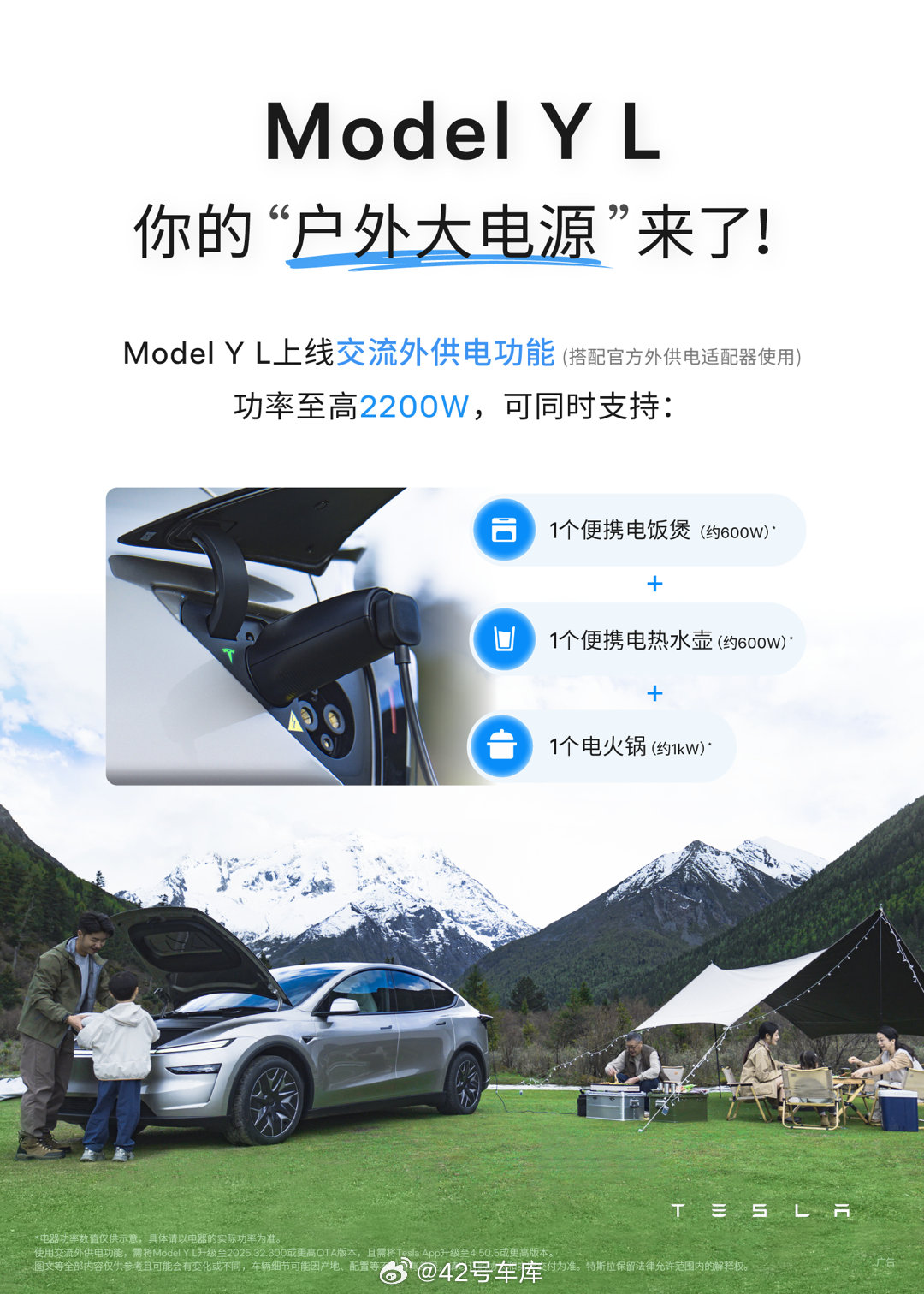 特斯拉 Model YL 上线交流外供电功能,最高功率达到 2,200 W。