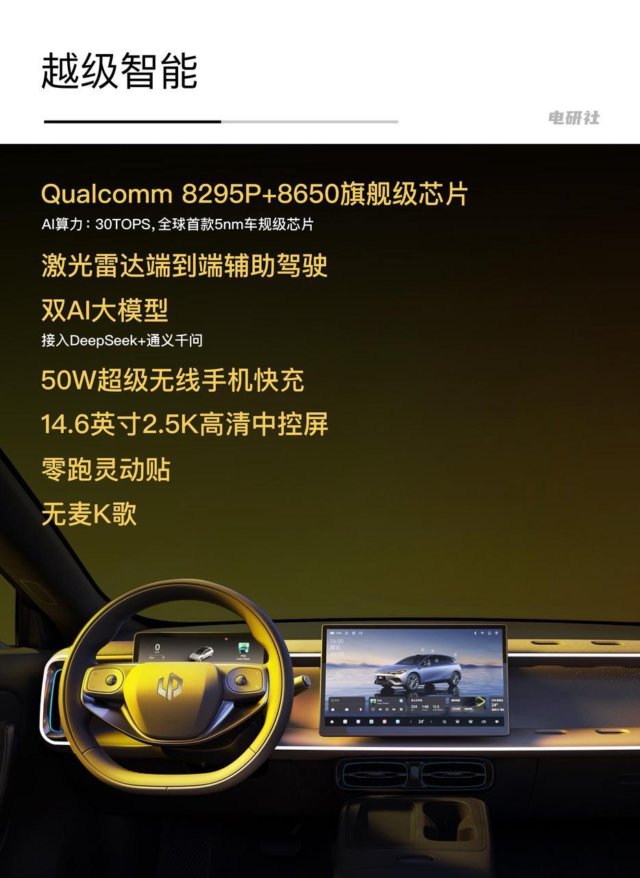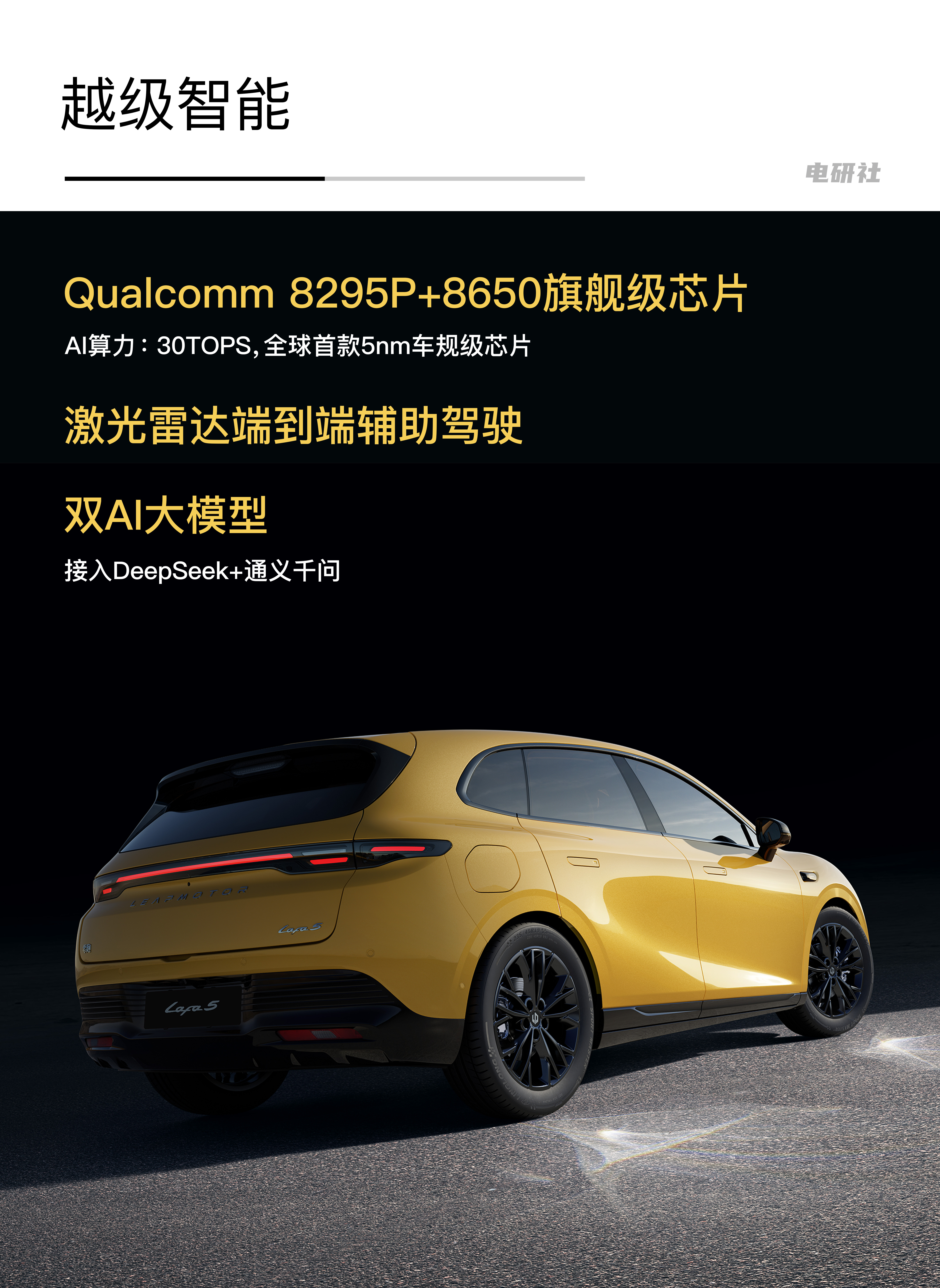 Lafa5搭载激光雷达与Qualcomm双旗舰芯片(8295P+8650),支持端到端辅助驾驶,让出行变得更轻松。语音助手接入双AI大模型(通义千问+Deepseek),没事还能和小零唠唠嗑。