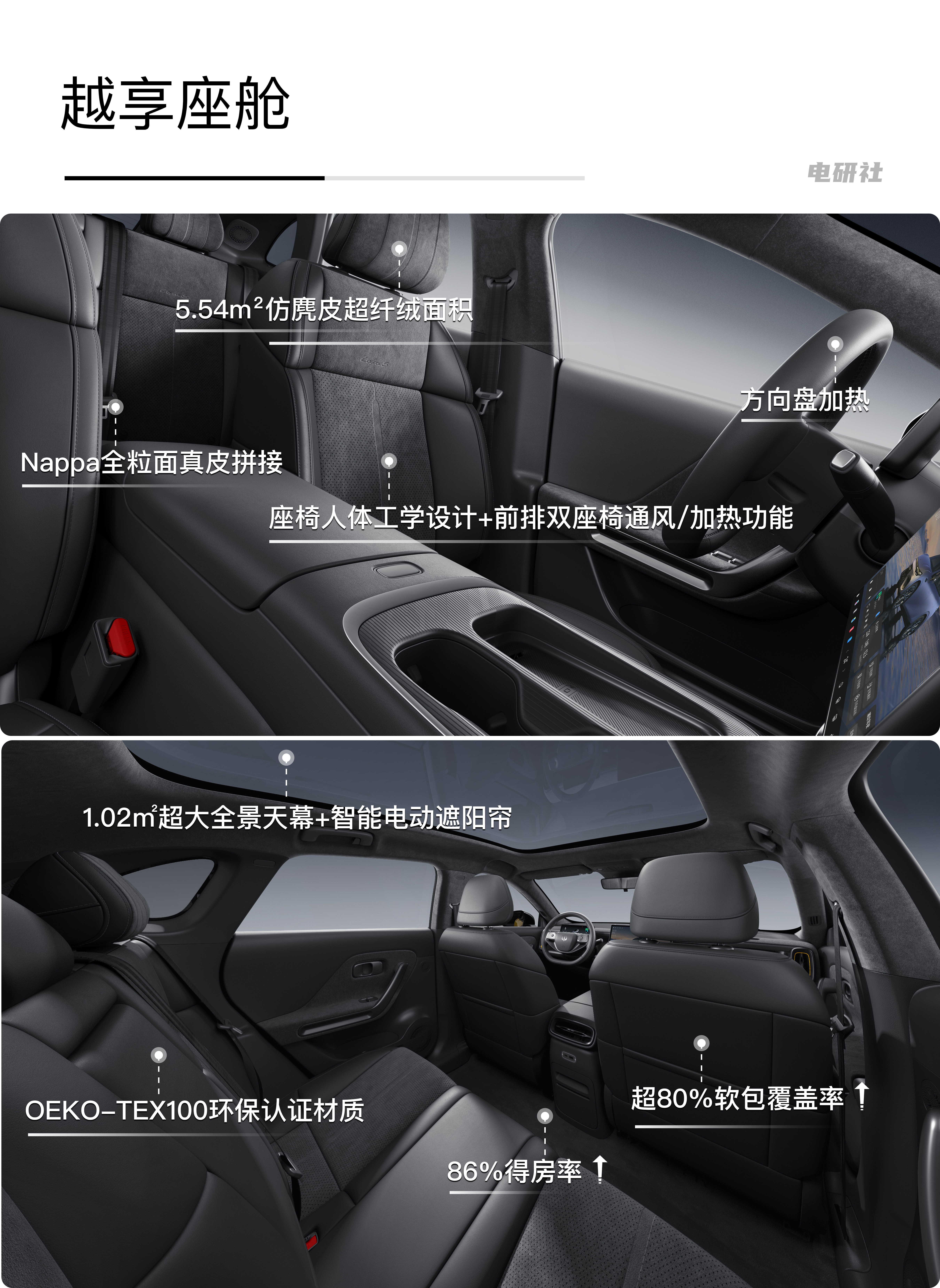 Lafa5的内饰主打一个品质感。采用「OEKO-TEX100环保认证」材质,5.54㎡的仿麂皮超纤绒与Nappa真皮拼接,柔软、环保又亲肤。1.02㎡超大全景天幕加上电动遮阳帘,白天日光不刺眼,夜晚看星空很治愈。