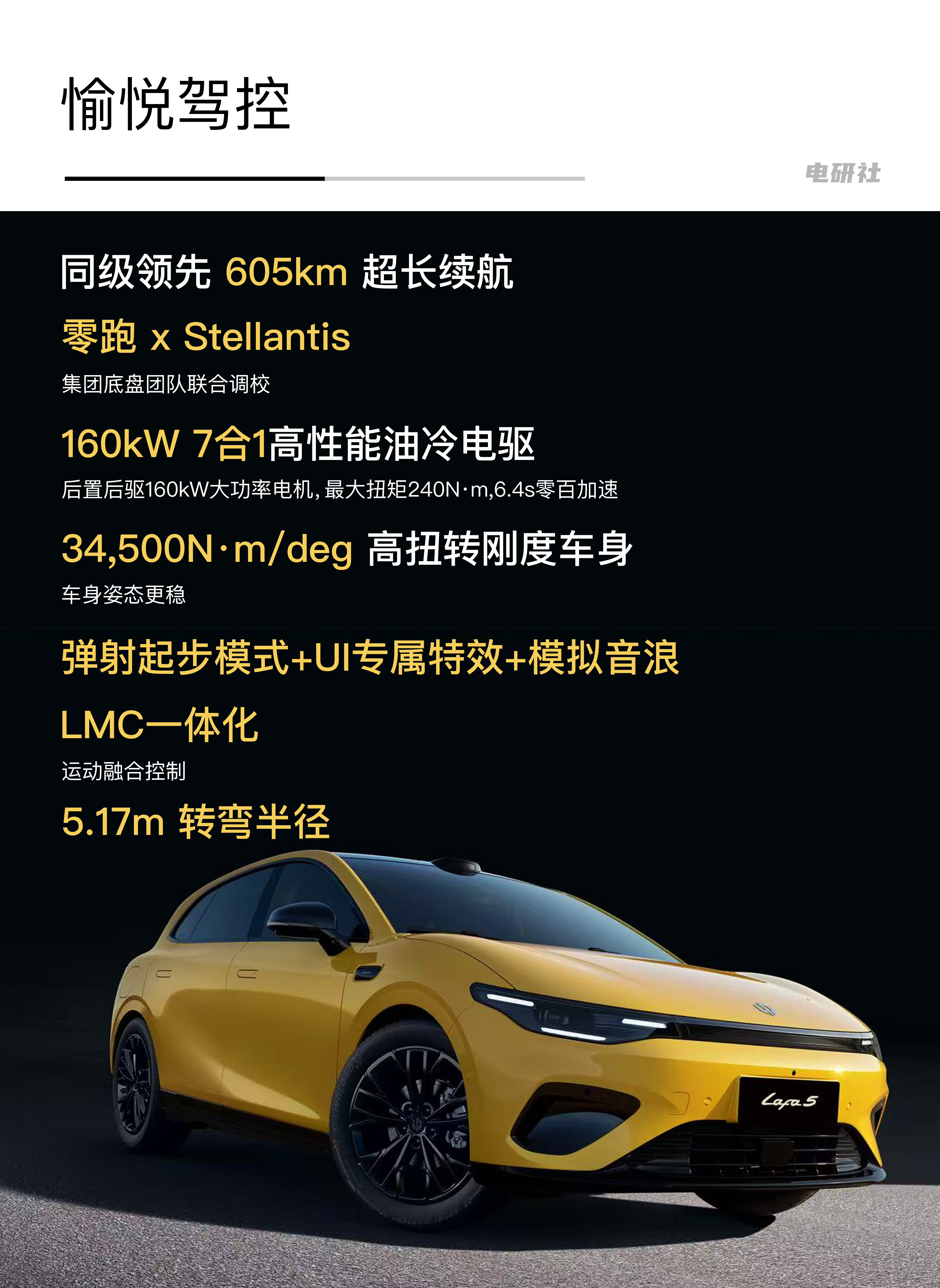 后驱布局、160kW电机、5.17m转弯半径,34,500N·m/deg高扭转刚度车身,加上零跑和Stellantis集团联合调校的底盘,适配多种驾驶环境。