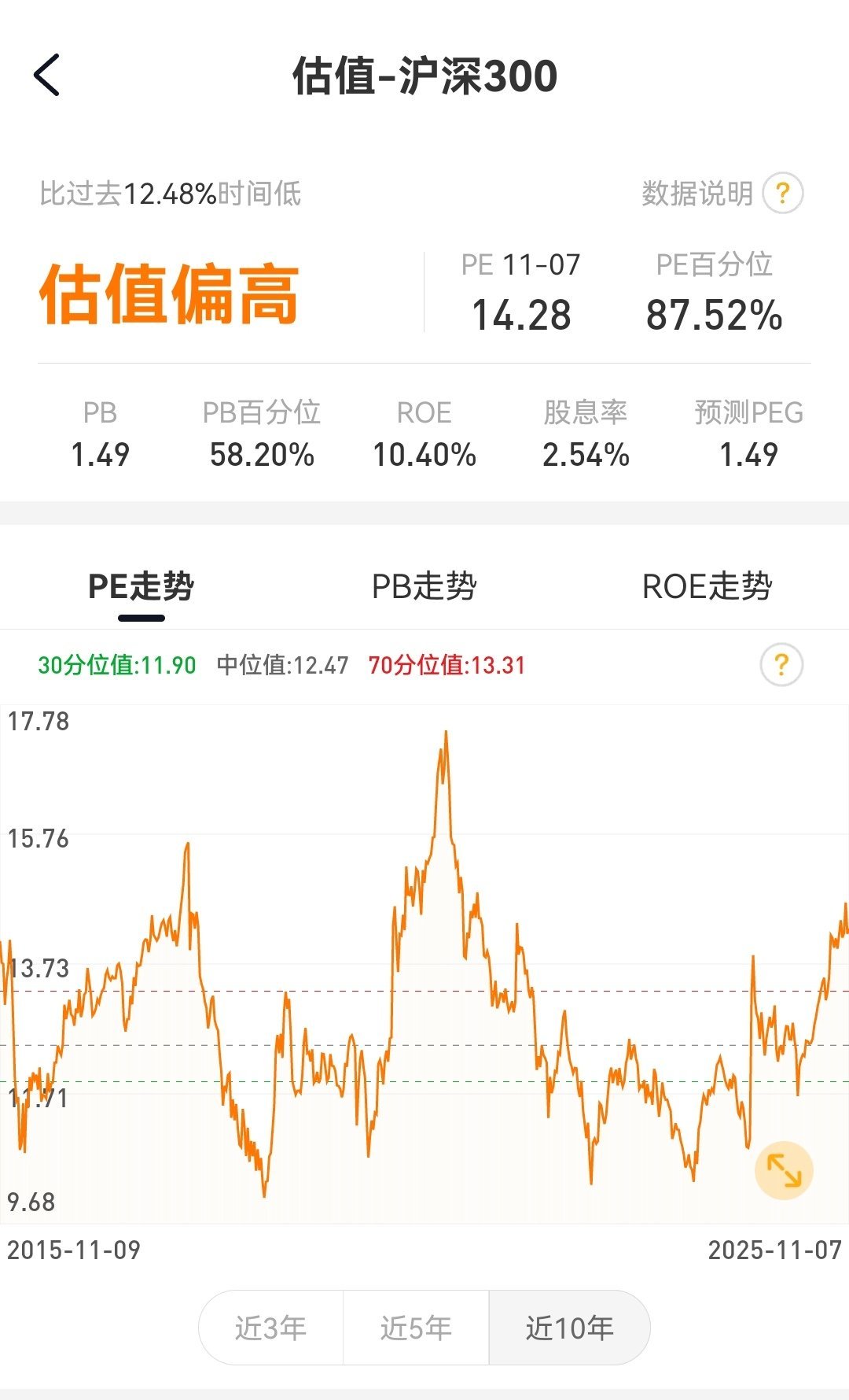 现在沪深300指数pe近十年百分位为87%,估值很高。