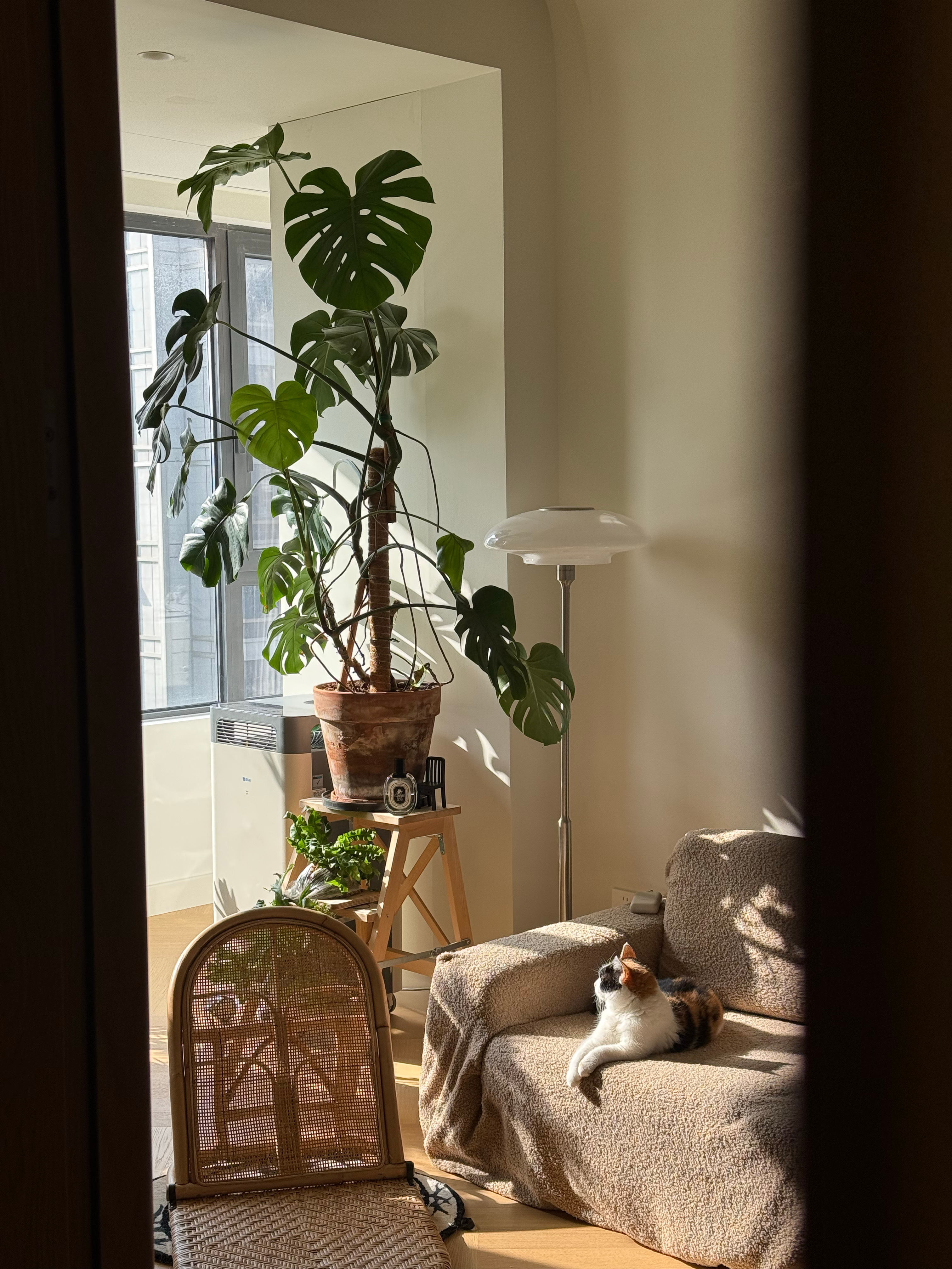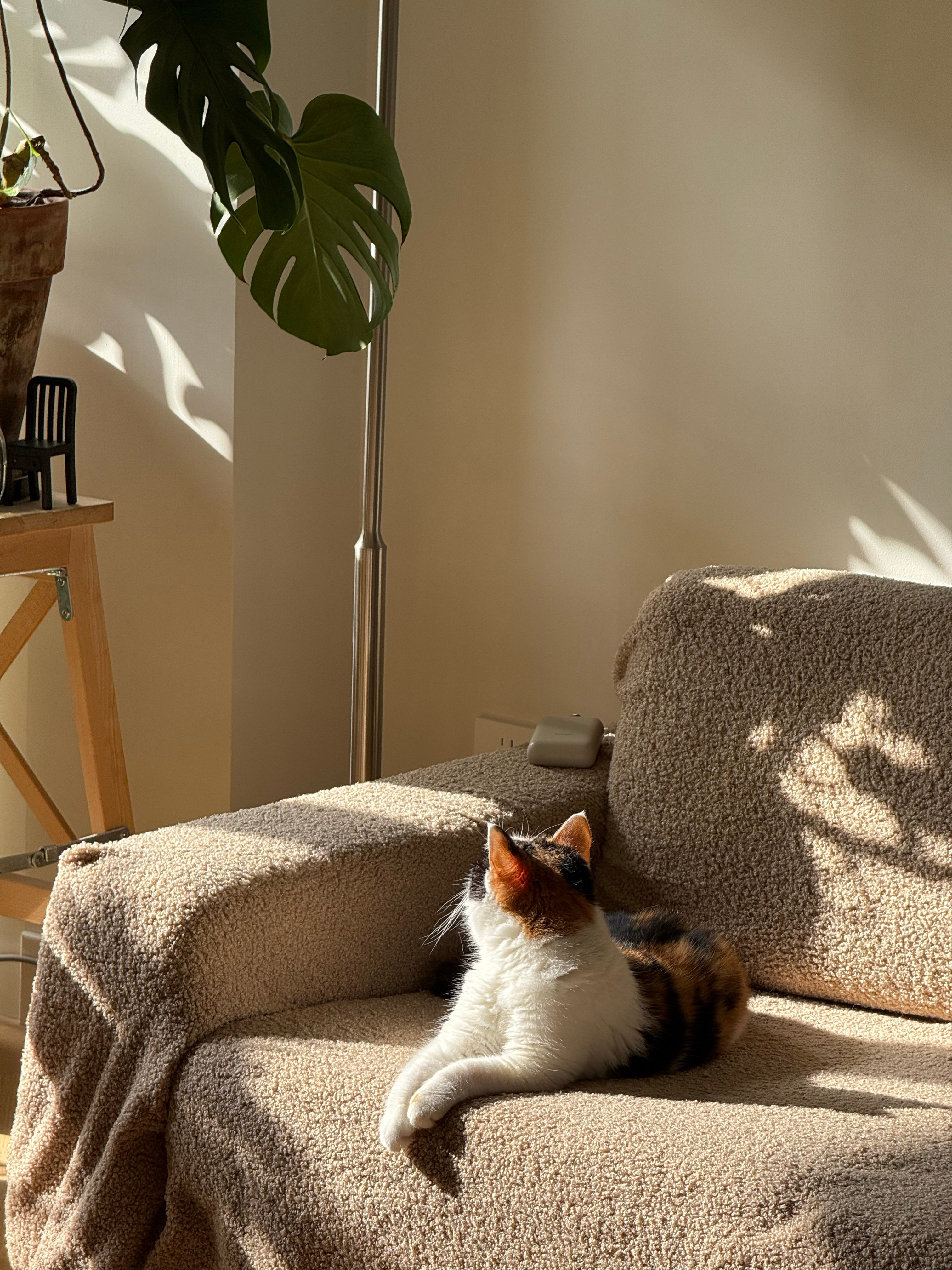悄悄偷看小猫咪在沙发上晒太阳,太美好啦!