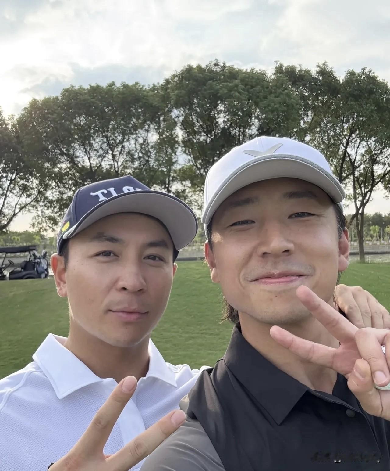 好神奇的交集,吴千语老公施伯雄和释小龙还是球友,两人一起打高尔夫,还一起比剪刀手合影。