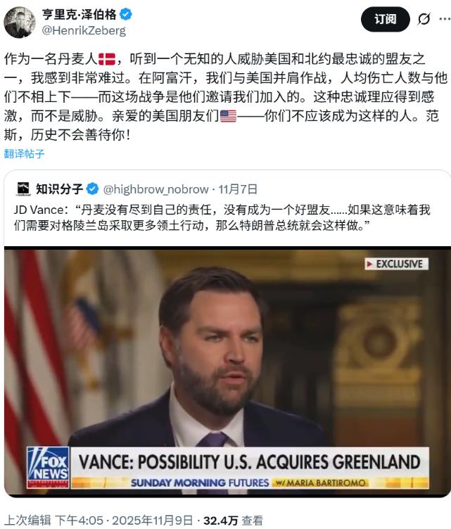 万斯表示:由于丹麦没有砸锅卖铁的发展军备,所以美国有权采取更多领土行动!意思就还是要吞并格陵兰岛?丹麦民众看了非常悲愤,但还能怎样?欧美世界就是这么强权的世界,美国吞不了其他中小国家的时候,就只能在内部吞并自己小弟的土地了! 你看看美国大军集结在委内瑞拉外海,就是不敢动手! 你看看美国大军还想集结在尼日利亚,也是没敢动手! 现在美国只能对北约集团内部的小弟动手了?真的实力差到了这个地步了吗?不敢对外龇牙咧嘴的叫嚣,难道只能欺负自己的小弟?窝里横的美国,就准备真的拿下格陵兰岛? 以前美国带着小弟吃肉喝汤,现在不行了,开始拿小弟祭旗吗? 美国真的混到了这份上了吗?