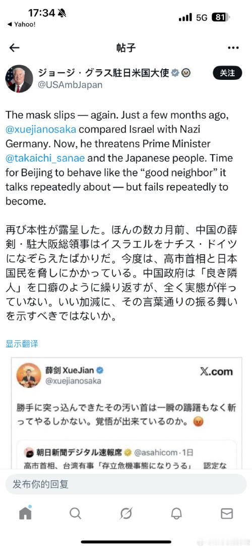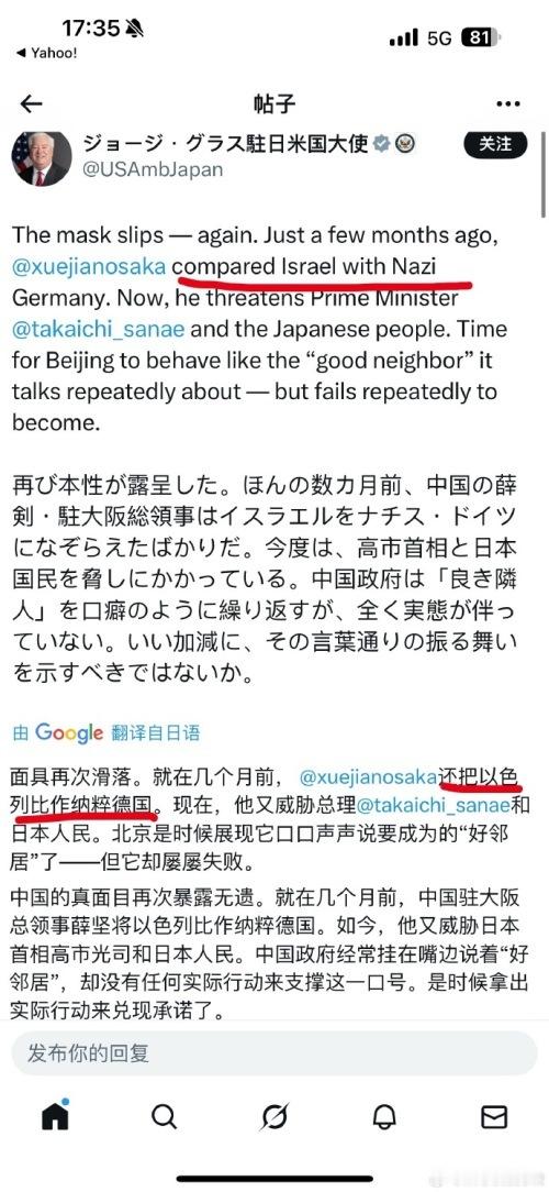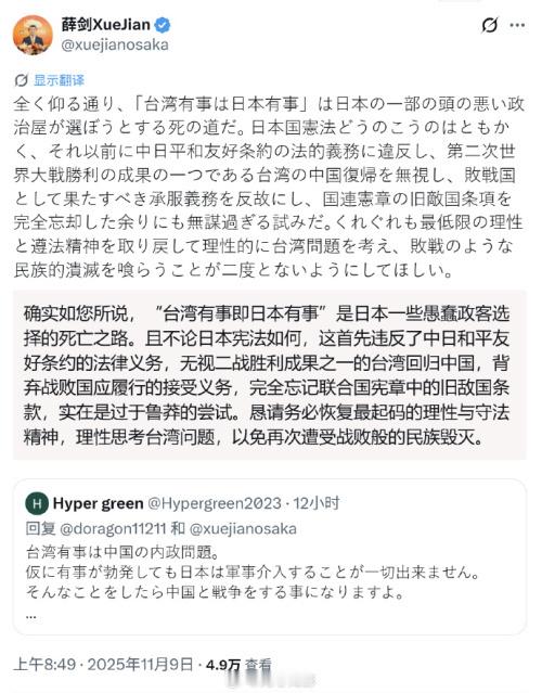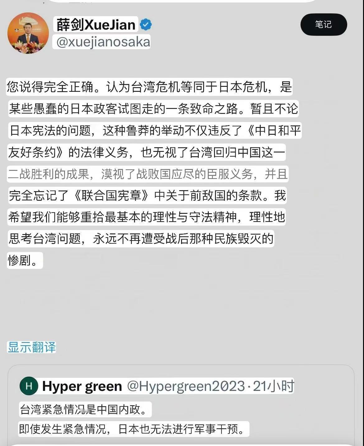 坚决支持中国🇨🇳驻日本大阪总领事薛剑及两条推文!