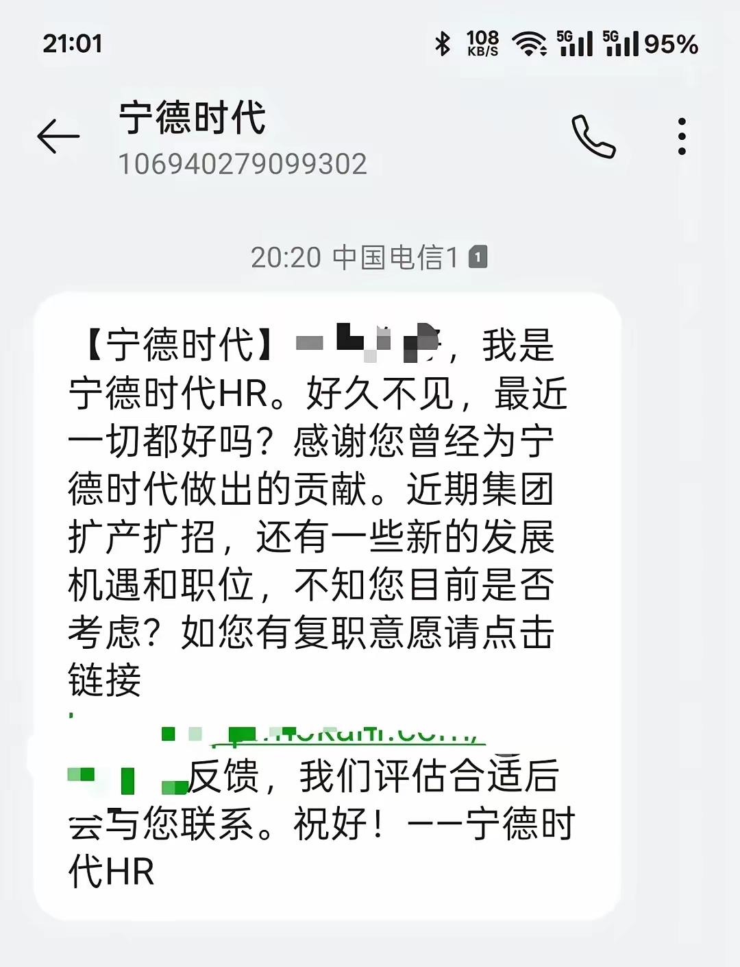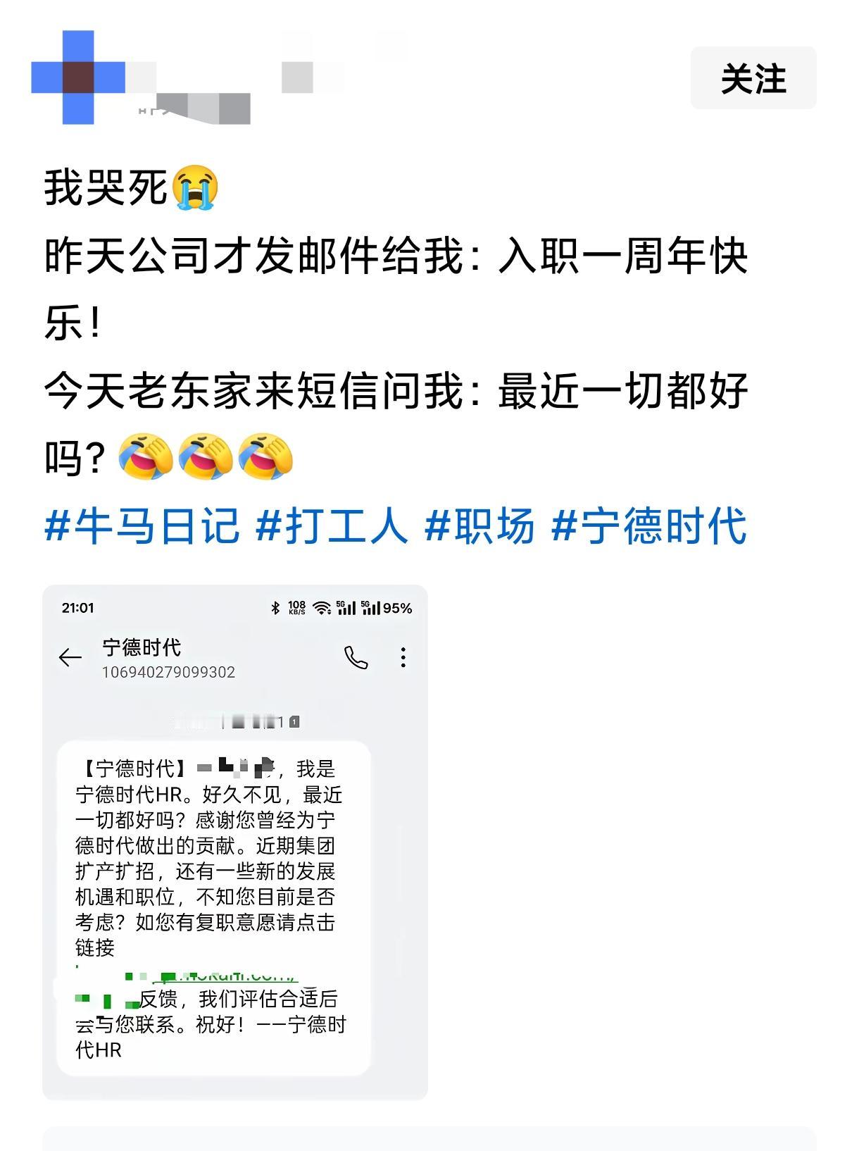 宁德时代给离职的员工发邮件,邀请回去效力 @何抱一 作为HR老鸟,宁德时代的离职管理做到这样,已经相当不错了。既联系了感情,也为未来的招聘埋了一个伏笔。 更关键的是,这表明人家并不歧视之前离职的前员工,这点很多公司做不到的。 你们公司会再次录用前员工么?