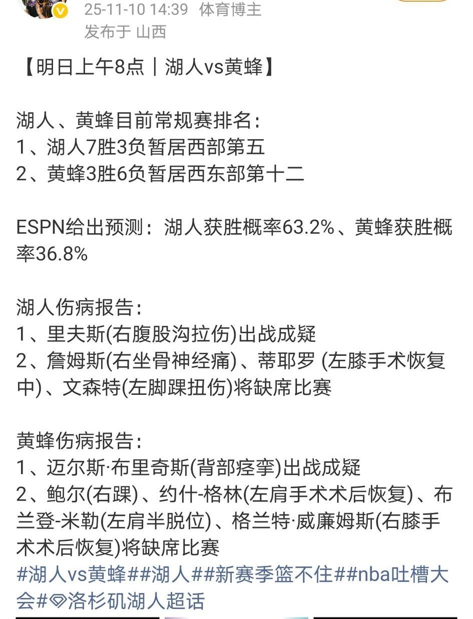 明天小破湖客场打黄蜂,一看这高达63.2%的胜率,内心有点慌啊…… 三球、布兰登·米勒、乔什·格林和格威确定缺席……湖人的里夫斯大概率能打。 这要是再拿不下来,真有点说不过去了,小破湖……