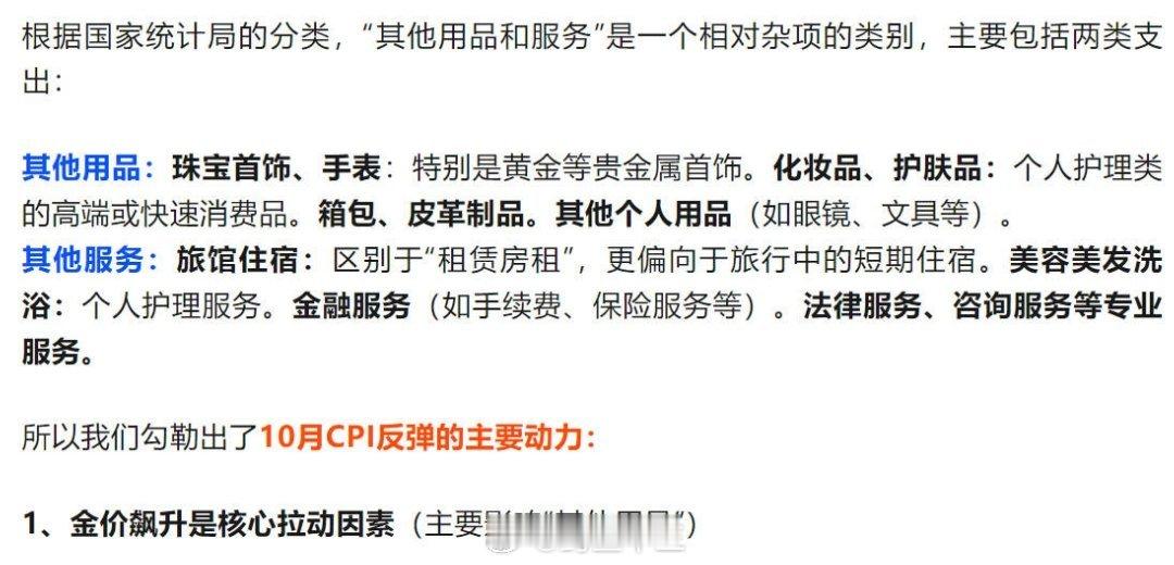 a股10月CPI由负转正,谁在涨?主要由“其他用品及服务”上涨了12.3%。这一