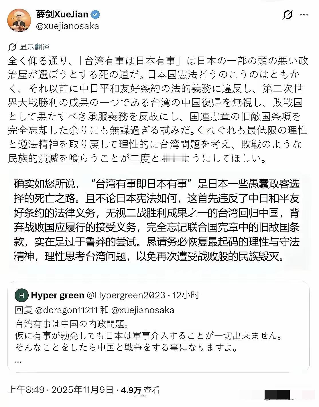 中国驻大阪总领事发推说:“确实如您所说,“台湾有事即日本有事”是日本一些愚蠢政客选择的死亡之路。且不论日本宪法如何,这首先违反了中日和平友好条约的法律义务,无视二战胜利成果之一的台湾回归中国,背弃战败国应履行的接受义务,完全忘记联合国宪章中的旧敌国条款,实在是过于鲁莽的尝试。恳请务必恢复最起码的理性与守法精神,理性思考台湾问题,以免再次遭受战败般的民族毁灭。” 《中日和平友好条约》1978年生效,核心是互不干涉内政、尊重领土完整。日本政客拿台湾说事,直接践踏条约精神,毫无外交诚信。 二战胜利成果有明确法理依据。《开罗宣言》《波茨坦公告》白纸黑字,台湾必须归还中国,这是国际社会公认的历史定论。 联合国宪章第107条“旧敌国条款”,专为约束二战轴心国而设。日本忘却战败国身份,干涉台海事务,正是触碰了这一底线。 日本宪法第九条明确规定放弃战争。“台湾有事即日本有事”的叫嚣,不仅违宪,更是在把日本推向战争的危险边缘。 台湾自古就是中国领土。从三国时期孙权派卫温赴台,到清代正式设省,数千年历史脉络,绝非政客几句妄言就能篡改。 1945年日本战败投降,正式将台湾归还中国政府。如今政客妄图翻案,是对历史正义的亵渎,也是对自身战败教训的遗忘。 中国驻大阪总领事的表态,字字句句站在法理与道义制高点。既是警告,也是规劝,希望日本政客迷途知返。 日本国内并非无人清醒。有媒体评论,“跟着美国干涉台海,只会让日本沦为棋子,最终付出惨痛代价”。 中国的主权和领土完整不容侵犯。解放军东部战区常态化在台海巡航,战机战舰随时待命,捍卫主权绝不手软。 日本经济高度依赖对华贸易。2024年中日贸易额达3.5万亿元,若因台海问题交恶,日本企业将首当其冲遭受损失。 历史的悲剧值得永远铭记。二战时日本军国主义发动侵略战争,最终导致本土遭重创,这样的教训岂能轻易忘却。 181个与中国建交的国家,均承认一个中国原则。日本政客逆势而为,只会让自己在国际社会陷入孤立。 所谓“台湾有事即日本有事”,本质是依附美国的霸权逻辑。日本甘愿当棋子,最终只会被霸权反噬,自食苦果。 中国始终坚持和平发展,但从不畏惧挑衅。若日本胆敢插手台海事务,必将遭到坚决反制,付出难以承受的代价。 台湾回归祖国是历史必然。任何外部势力的干涉,都无法阻挡这一滚滚洪流,日本政客的愚蠢行径终将徒劳无功。日本外交 日本对华外交 大阪新闻 麻烦看官老爷们右上角点击一下“关注”,既方便您进行讨论和分享,又能给您带来不一样的参与感,感谢您的支持! 各位读者你们怎么看?欢迎在评论区讨论。