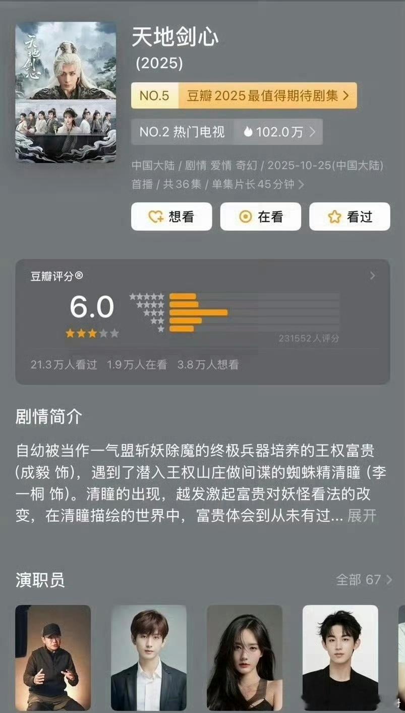 成毅 李一桐《天地剑心》开分6.0,打分人数23w+,什么水平?