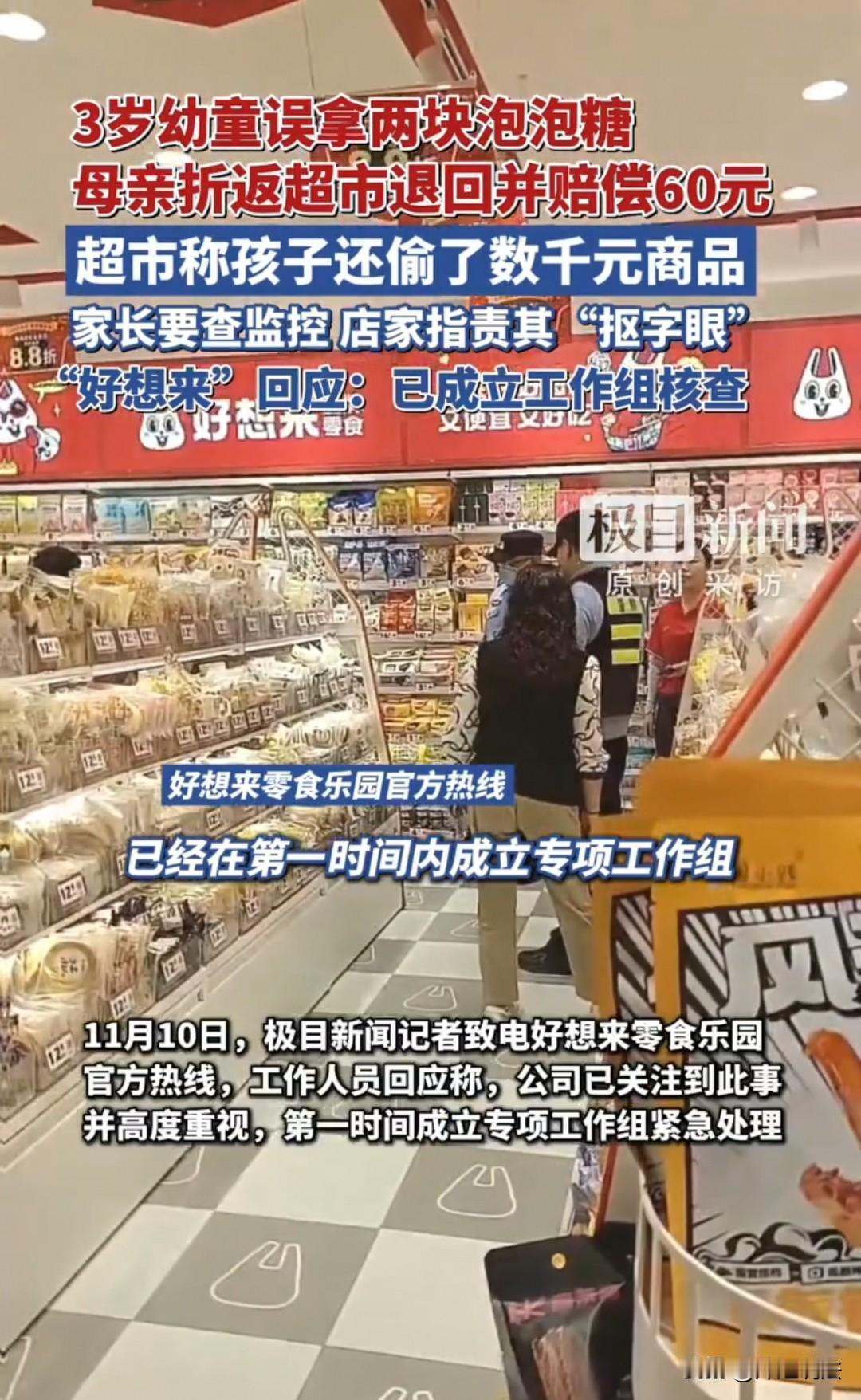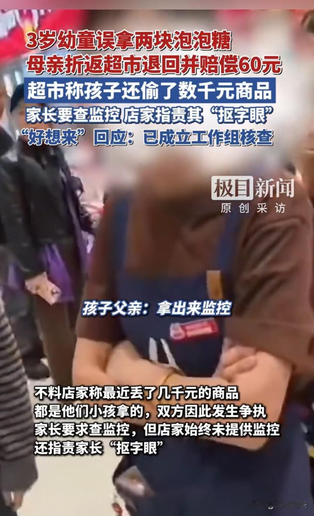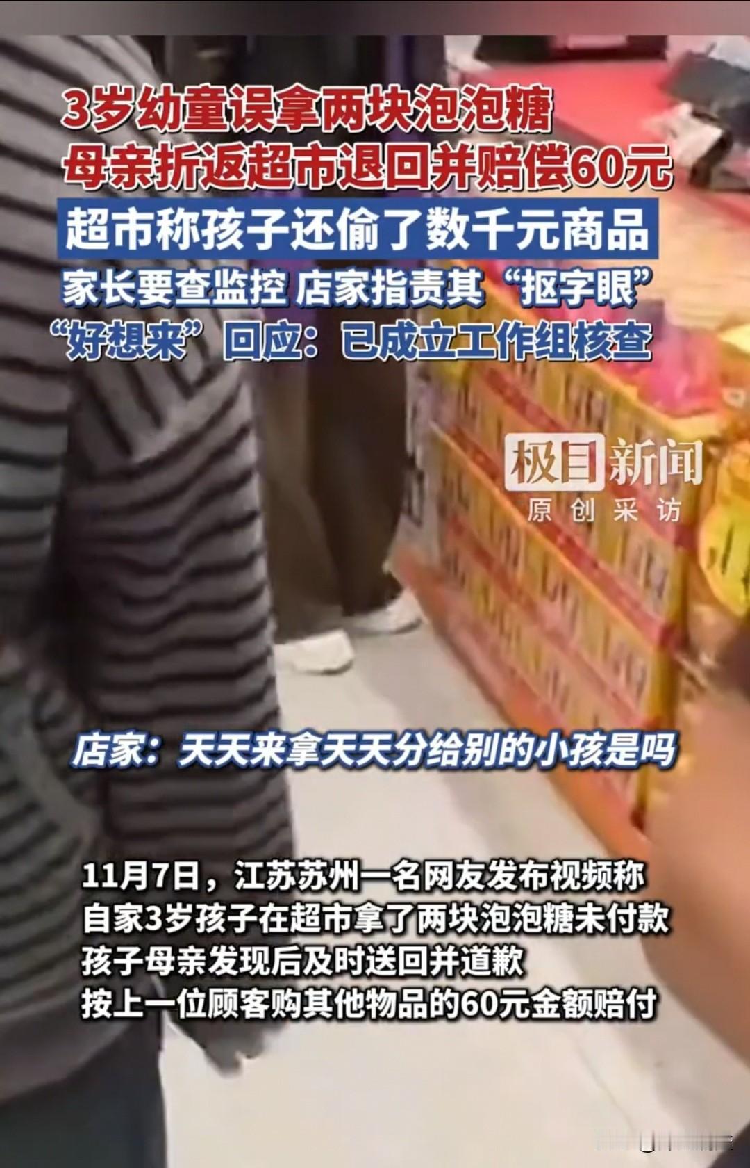 江苏,三岁幼童拿走几颗泡泡糖,家长主动给予60元赔偿,店员不满意,说店里最近损失了几千元,这小孩子偷走的,要追加赔偿。家长要求拿出视频,若是真的,十倍百倍的赔偿都没问题,店员却和家长抠字眼争执。现在店家已成立工作小组进行调查,事后会给予大家一个回复。 在琳琅满目的超市内,一名店员正在和家长吵闹,还说道,小孩子天天来,天天拿泡泡糖分给他小朋友,是吧? 家长也有些生气,怎么能平白无故冤枉自己的小孩子呢?你要说我们偷了你的东西,那你调出监控给我们看呀,凡事都需要证据,而不是平白无故说什么就是什么。 最开始,大家都以为是三岁的孩童不懂事,拿了几颗泡泡糖,孩子的妈妈便主动拿回去退还给店家,还按照上一位顾客的购买价格,主动支付了60元作为赔偿。 不过大家不解的是,这一幕其实很温馨,但店家为何还得理不饶人?不就是小孩子拿了几个泡泡糖吗,人家不仅主动退回,还多赔了那么多钱,实在没必要如此。 但事后有人发出更具体的情况说明,讲述小孩子当天是直接跑进超市拿了一些泡泡糖,出来就分给了其他小朋友,后来这个小朋友又拉着另外一个小朋友一起进去拿。 这时,店员刚好看到了。孩子的妈妈发现后,立即从小孩子手里把泡泡糖拿过来,并且主动拿去收银台付款,还表示愿意以十倍的价格赔偿对方,所以才给了60元。 这期间原本没有发生任何矛盾,可回家后,小孩子的爷爷觉得不公平,怎么几颗泡泡糖就要给60元?于是便又来到店里,找店员讨要说法。 这时,一位女店员才说,你们家小孩天天来拿泡泡糖,拿出去就分给别的小朋友。家长当即要求店员把监控调出来,若是真有此事,别说十倍,百倍赔偿都愿意承担。 这段争执的视频在网上传播后,引起了大家的舆论热议,多数人都觉得店员的做法不合理,不能这样诬陷一个小孩子,更不能得理不饶人。 但是知情人发出的内容却有出入,称当时家长带着所谓的律师朋友来到店里,有意引导店员说出那样的话,导致大家对店家产生了误判。 其实当时店家全程都有监控,也完整记录了双方的对话,但店家并没有将监控公开。一是为了保护小孩子的隐私,二是也不想因为此事影响自家的生意,希望私下和平处理就好。 知情人表示,中途从来没有说过损失几千元东西,也没有说过小孩子偷了几千元的东西,这些说法完全是无中生有。 说到底,家长一方的目的就是觉得小孩子当时只拿了几个泡泡糖,却支付了60元,心中不服气,所以事后才不断找事。 有曾在该店工作过的人表示,店员不该说出这样的话,因为入职后都会经过培训,明确规定不准与顾客吵架。 因此,他认为视频内容是家长有意找茬、刻意引导,甚至恶意剪辑出来的。 其实,不管这件事谁对谁错,孩子拿泡泡糖时店员未及时发现,这是店家的责任。毕竟三岁孩子对物品所有权没有清晰认知,可能误以为超市里的东西可以随便拿。 作为家长,同样存在过错。平时应好好引导教育孩子,明确告知他们,东西不花钱买就不是自己的,不能随便拿,更不能拿出来分给小朋友。 此外,几颗泡泡糖即便被孩子拿取,店家为何要收下60元?这无疑是矛盾的导火索。如果发现小朋友有这种举动,日后多加留意、及时提醒即可,没必要收取如此高额的赔偿。 即便这是家长主动提出的,店家也不该这样做。对孩子应多些宽容,对主动认错、积极赔偿的家长,更应怀着理解与认可的态度,怎能堂而皇之地收下60元? 而家长这边,孩子不懂事,家长难道也不懂事吗?60元没能让孩子认识到擅自拿取他人财物的不当之处,即便店家出于包容不追究,家长也不该事后以德报怨,返回店里争执,这样的做法实在不妥。 1、3岁幼童拿取泡泡糖不构成偷窃。 根据《刑法》第十七条,3岁幼童无刑事责任能力和主观故意,不构成偷窃;家长负民事赔偿和监护教育责任。 2、家长付60元超额赔偿后,爷爷没有权利要求返还。 根据《民法典》第一百五十一条,需举证支付时显失公平或重大误解,否则无法返还;自愿赔偿后反悔需承担举证责任。 3、店员无证据称“孩子天天拿糖”是侵权行为,店家要担责。 根据《民事诉讼法》第六十七条,无证据言论若影响名誉则构成侵权;店家需举证,否则承担赔礼道歉等责任。 对于此事,大家如何看待?素材来源于:极目新闻2025年11月10日报道