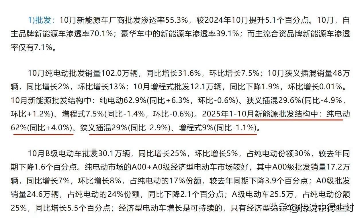 纯电不仅是未来,现在可能已经是了! 乘联会数据:今年1-10月,新能源批发销量中