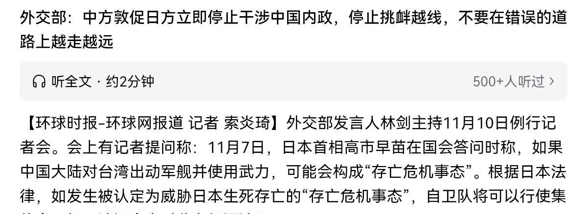 我们外交部出来回应了!对于高市早苗的言论,11月10日,我们的外交部发言人表示,