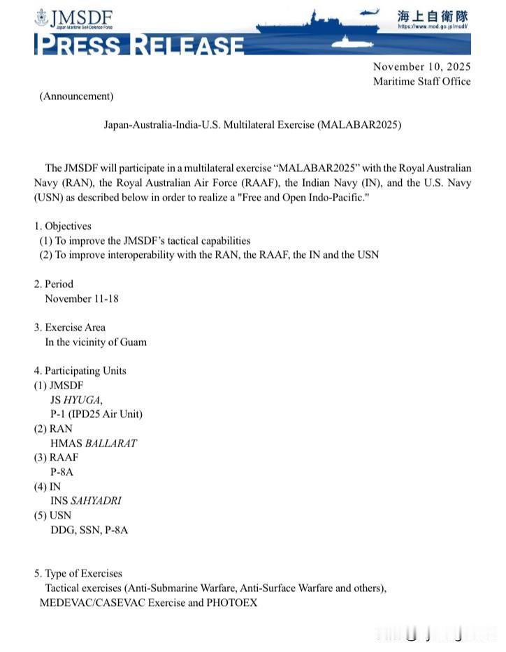🇯🇵日本海军携驱逐舰-直升机航母“日向”号(DDH-181)及一架P-1巡逻机参加“马拉巴尔2025”联合军演。 该舰于2025年11月6日(如图)至10日期间,从其母港佐世保海军基地前往美国关岛海军基地。