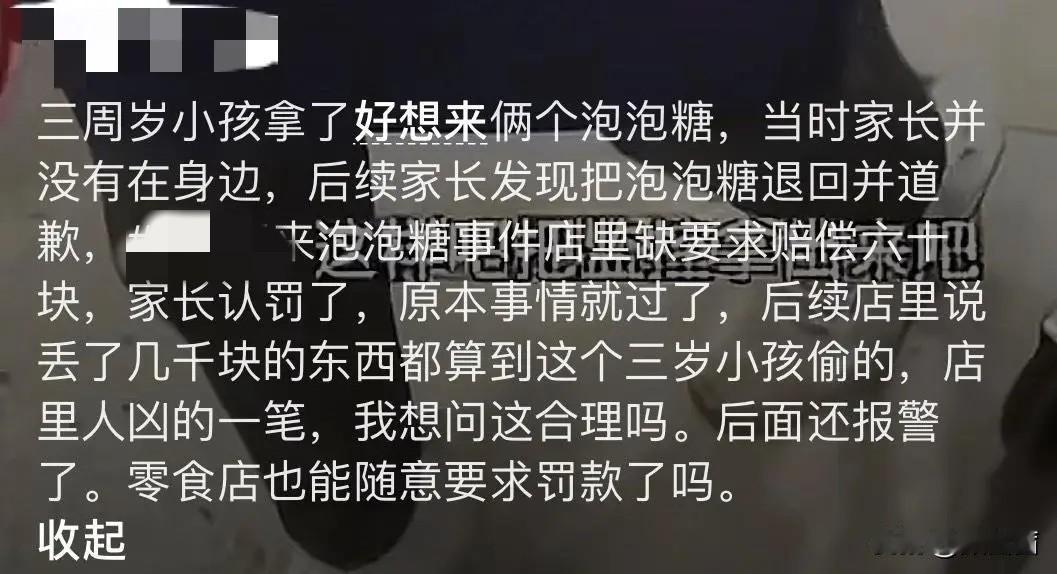 3岁娃误拿两块泡泡糖,妈妈主动赔钱道歉,结果被超市说偷了几千块东西?这事也太离谱了! 事情发生在苏州的“某零食乐园”,11月7号那天,宝妈带娃出门,孩子趁大人不注意拿了两块泡泡糖没结账。 发现后宝妈立马带娃回店道歉,还按店家说的,赔了上一位顾客消费的60块钱。 本以为这事就过去了,没想到店家老板娘突然说,店里最近丢了几千块的货,全是这孩子偷的! 孩子爸爸赶到后气得不行,当场要求看监控,还说有证据就愿意10倍、100倍赔偿,可店家始终拿不出监控,还指责家长“抠字眼”。 现在周边商户都知道双方吵过架,涉事超市还在正常营业,但记者打门店电话一直没人接。 好在事发超市官方已经回应了,说成立了专项工作组在核查,有进展会第一时间通知大家。 就想问问,3岁孩子哪能偷几千块的零食?到底是真丢了货,还是想让孩子“背锅”? 等着看后续调查结果!